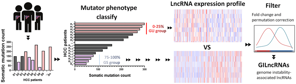 Somatic acquired genomic instability is one of the hallmarks of malignancy cancer [64]. Aberrant lncRNA levels are contributed to abnormal mutation and expression of genes involved in both tumor initiation and progression [65]. To recognize genome instability-associated lncRNAs (GILncRNAs), we constructed a computational frameworks integrating somatic mutator information and lncRNA expression profiles of tumor genome (Figure 8): (i) total cumulative somatic mutations of each sample was calculated; (ii) samples were ranked based on cumulative number of somatic mutations from high to low; (iii) The top 25% samples in the ranking list were set as genomic unstable (GU)-like group while the last 25% were set as genomically stable (GS)-like group; (iv) lncRNA expression profiles between the GU group and GS group were filtered; (v) GILncRNAs were identified according to the criteria: |fold change| > 1.5 and false discovery rate (FDR) adjusted P<0.05.