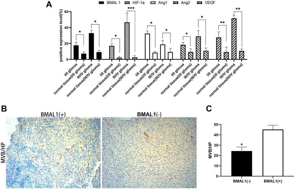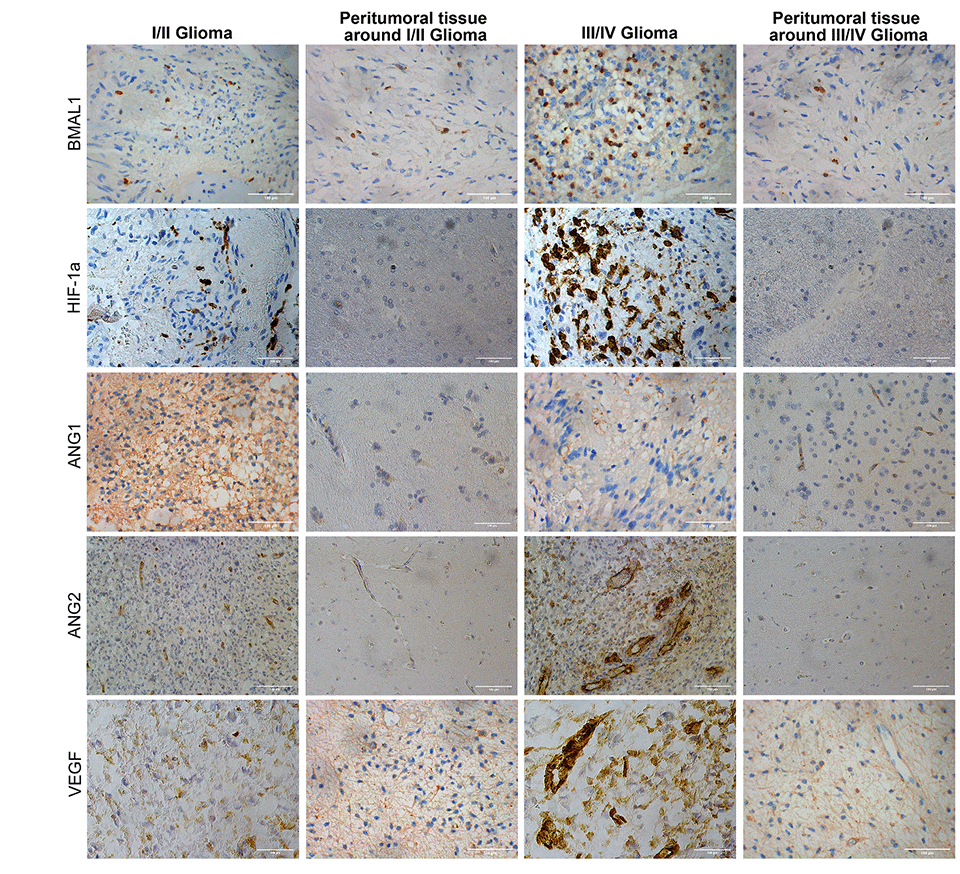 In recent years, rhythm genes have been suggested to be related to the occurrence and development of various tumors, including breast cancer, colon cancer, and glioma [11–13]. As the core gene of rhythm gene, BMAL1 is an important regulator that maintains normal cell and tissue homeostasis and plays an extremely critical role in tumor-related processes, such as cell proliferation and apoptosis, DNA repair, metabolism, and angiogenesis [14–17]. BMAL1 is also considered a pro-tumor factor in glioma that promotes the proliferation and migration of glioma cells [18]. Therefore, an examination of the regulatory effects of BMAL1 on the expression of the angiogenic factors ANG1 (Angiopoietin 1), ANG2, and VEGF in glioma will be conducive to understanding the reasons for glioma tolerance to vascular targeted therapy and the development of new target drugs. HIF-1a is an important regulatory factor of tumor angiogenesis. It was previously reported that HIF-1a can induce increased expression levels of Ang2 and VEGF in hypoxia environment [19]. Therefore, in this study, we examined the correlation between the expression of the BMAL1 gene and the expression of HIF-1a, ANG1, ANG2, and VEGF in human glioma tissues, as well as the relationships between the expression of the BMAL1 gene and the number of tumor microvessels and peritumor edema.