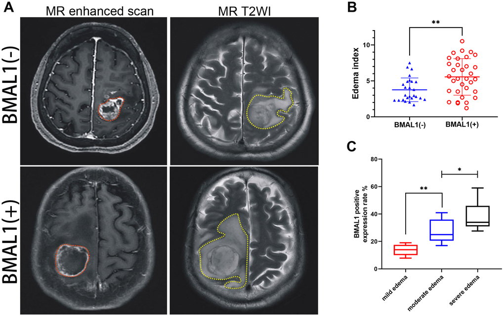 According to the EI (edema index), we performed peritumor cerebral edema grading in 79 patients with glioma [21]. The median EI was 4.79 (range, 1.20–10.52): 0 with no edema, 16 (20.3%) with mild edema, 26 (32.9%) with moderate edema, and 37 (46.8%) with severe edema (Table 5). Although clinical MRI scans suggested that all patients had peritumor brain edema to varying degrees, compared with the BMAL1− patients, patients with BMAL1+ expression were more likely to exhibit moderately severe or severe brain edema (Figure 3A and 3B). Furthermore, we analyzed the BMAL1 levels in different edema groups. The BMAL1 expression level in the moderate edema group was higher than that in the mild edema group (P < 0.01), and the expression level in the severe edema group was higher than that in moderate edema group (P < 0.05) (Figure 3C).