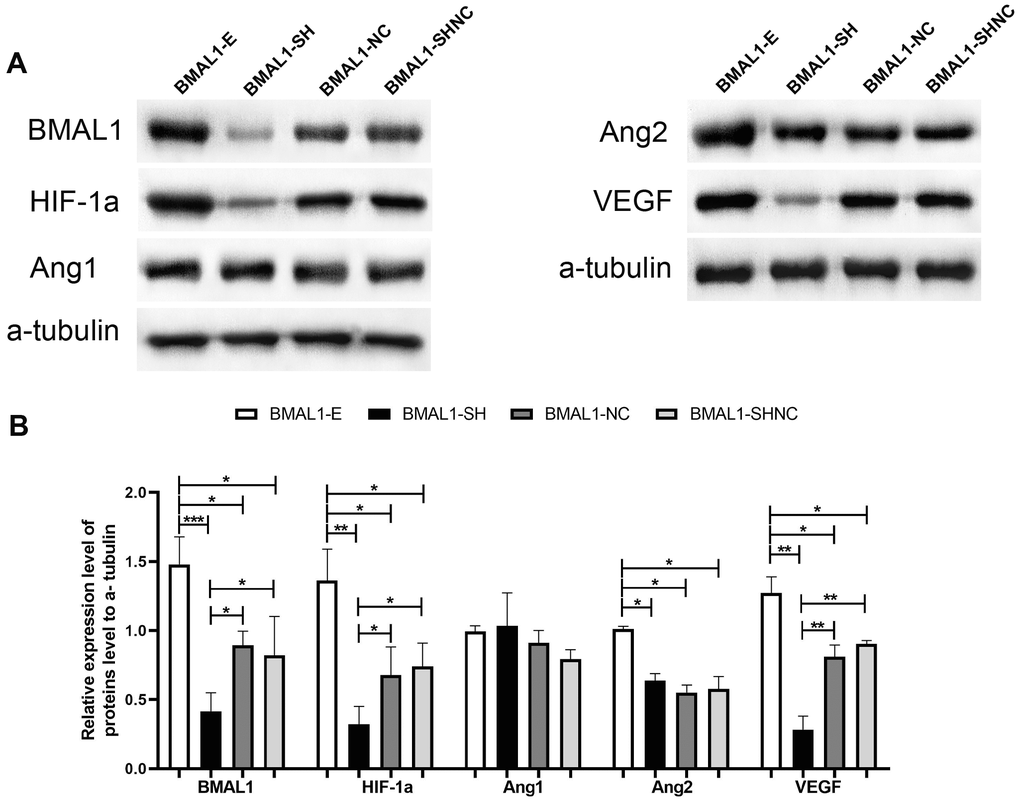 The virus stock was diluted to an appropriate MOI (multiplicity of infection), and the diluted lentivirus was added to the primary cultured cells. Puromycin was used to screen stably transfected cells. Finally, the following four groups were obtained: the BMAL1 overexpression group (BMAL1-E), BMAL1 overexpression control group (BMAL1-NC), BMAL1 silent expression group (BMAL1-SH), and BMAL1 silent expression control group (BMAL1-SHNC). Cells from these experimental groups were cultured in 6 well plate. After reaching 70% confluence, the cells were lysed on ice using RIPA buffer. After protein extraction, the protein samples were loaded in the wells of SDS-PAGE gels and separated. The expression of target proteins BMAL1 (ab231793, ABCAM), HIF-1a (ab114977, ABCAM), ANG1 (ab133425, ABCAM), ANG2 (Ab155106, ABCAM) and VEGF (ab32152, ABCAM) was detected by Western blot.