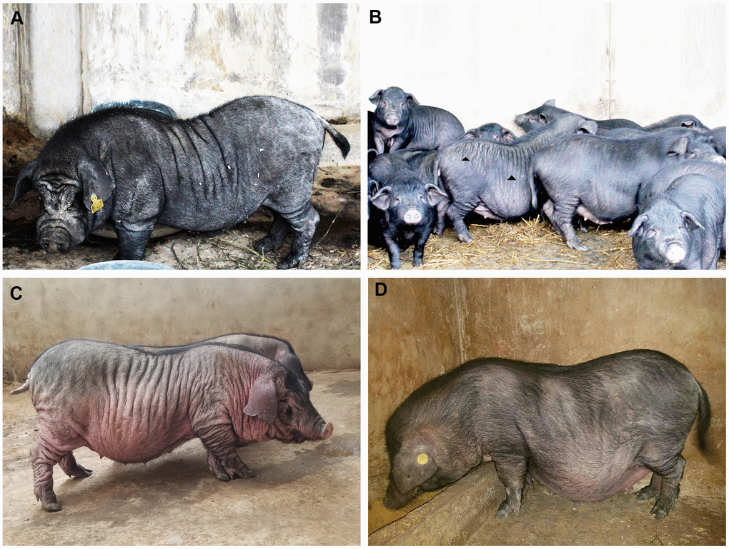 Under natural conditions, young mammals rarely have systemic skin wrinkles. Skin wrinkles generally appear in adulthood and increase with age. But there are a few special cases in some mammals, such as Chinese Shar-Pei dogs and Birman cats, show systemic skin wrinkles at very young age or at birth. In Xiang pigs, the systemic skin wrinkle phenotype was found in a few of individuals, and appeared in two months after birth and became more and more obvious with age. Originally, the mutated phenotype was observed in a boar and among his offspring, accounting for about 1-3% of the entire populations. The trait of WXP characterizes autosomal recessive heredity, and its genetic mechanism is unknown.