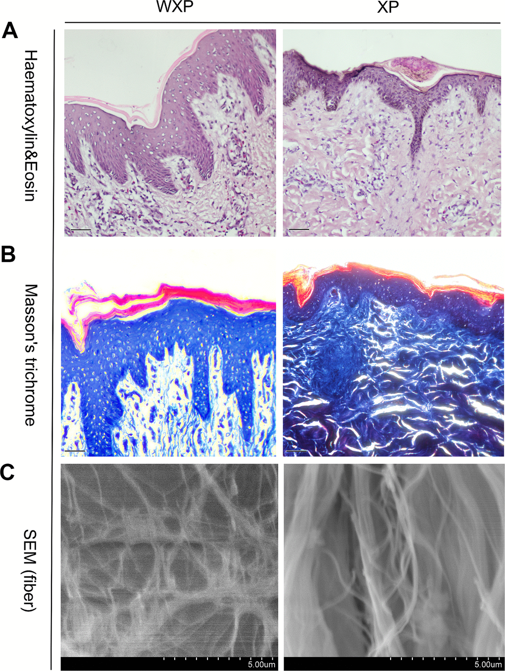 The skins of three WXPs and three XPs were used for histological examination, about one years old. The skin above the longissimus dorsi muscle were dissected from WXPs and XPs and then fixed in 4% paraformaldehyde. The longitudinal histological sections derived from skin were stained with hematoxyline and eosine, as well as with the Masson trichrome method to visualize collagen (blue) as previously described [62]. Similarly, taken the skin, removed the epidermis to expose the dermis layer and cut to the appropriate size, placed it in 3% glutaraldehyde fixative solution for initial fixation for 20 h, rinsed 3 times with 0.1 mol·L-1 phosphate buffer, used different volume fractions of ethanol-water solution (10%, 30%, 50%, 75%, 100%) dehydration, each gradient dehydration 15 ~ 20 min, pure ethanol dehydration twice, gradient excessive to acetone, freeze-drying, used ions sputter gold coating to prepare skin samples, observed under a scanning electron microscope.
