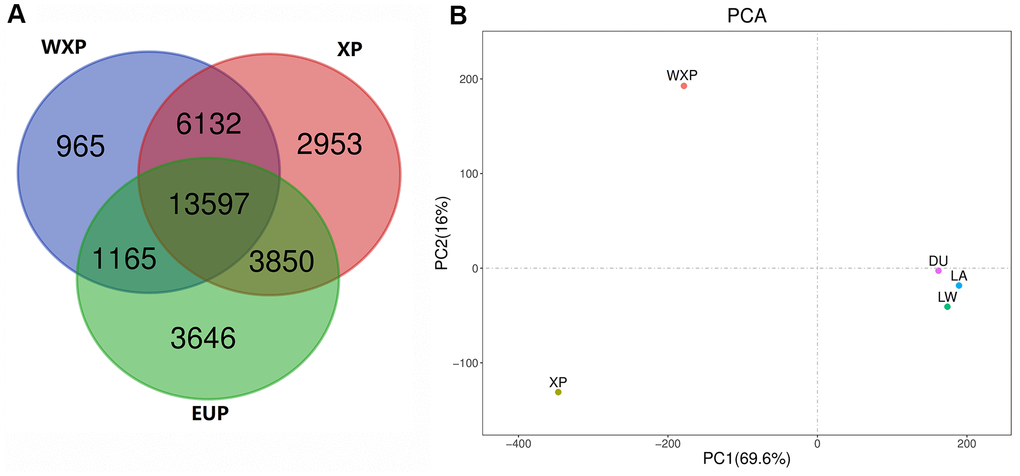 We carried out principal component analysis (PCA) on the SV pattern data (Figure 3B). The PC1 differentiated between China (XP AND WXP) and European pig breeds (LW, LA, DU) geographically. The PC2 reflected the biological distinguish from XP and WXP. It suggested that the data groups were clearly clustered and can be used for subsequent screening of mutation sites.