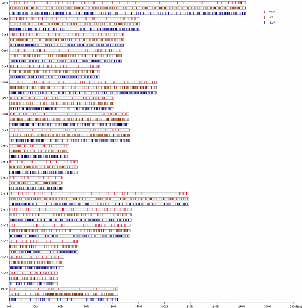 The Xiang pig genomes from wrinkle and normal samples were sequenced using Illumina HiSeq2500 and all data were subjected to quality assessment to obtain clean data. In addition, we downloaded the genome resequencing data of 21 European pigs (EUP) belonging to three breeds from NCBI database, and followed the same method for quality assessment. Total of 0.95 Tb sequences with an average depth of 9.90 × were obtained form 35 pigs (Table 1 and Supplementary Table 4).