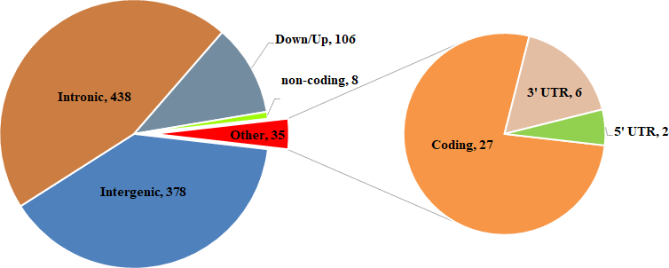 Compared SV distribution among three groups (Figure 3A), we identified 965 specific SVs in WXP group (DEL=715; DUP=78; INS=167; INV=5). The distribution of these population-specific SVs was presented in Figure 4 and Supplementary Table 7. Among the SV types identified, the indels (insertion and deletion) were the most abundant structure variant types (91.4%). Both DUPs and INVs only accounted for 8.6% of total SVs. It showed that these SVs were randomly distributed on all chromosomes except for chromosome Y. We also examined the genomic location of the b WXP-specific SVs and found that most of them (n = 438, 45.38%) were located in intron and that 378 SVs (39.17%) were located in intergenic regions, 35 SVs (3.62%) in exon or exon-intron regions, 106 SVs (10.98%) in upstream or downstream region of genes, 8 SVs (0.83%) in untranslated regions (Figure 5). These SVs impacted 553 Ensembl genes (Supplementary Table 7), including 481 protein-coding genes, 2 pseudogenes, and 37 noncoding RNA genes. Most of these genes (n=527, 92.3%) contained only a single SVs, while fewer of them (n=26, 4.7%) harbored two or more SVs. We further predicted the impact of SV events on host genes (Supplementary Table 7). We believed that 60 SVs have an important impact on gene function by Variant Effect Predictor (VEP) annotation. Only three of deletions were predicted to have a high impact, including stop lost on CHD3 and novel gene (ENSSSCG00000029231), frameshift variants in uncharacterized protein gene (ENSSSCG00000037023). 23 deletions/insertions and 1 duplication in exon or exon-intron regions had an important impact as modifier, including 4 frameshift variants on RBPJ, PPP2R1A, PRRC2A, and TNXB genes, 13 potential aberrant splicing variants on 12 genes (LMNA, NOLC1, MAGED1, HGS, EIF4G2, DDX5, HSP90AB1, ATP5F1B, RAB1A, PABPC1, PABPC1 and NEFM). Eight SVs changed the UTRs length of 8 genes (MDM2, CHD3, ROS1, ABCF3, HLX and 3 novel genes). Additionally, we found that 25 deletions/insertions resulted in loss of TFs binding sites and promoters of 23 genes (including TFF2, SFXN2, RNF14, RARA, RALGPS1, PRDX1, MTMR8, MTBP, LMNB1, EIF6, DNAJB14, COLQ, CCL5, C12orf73).