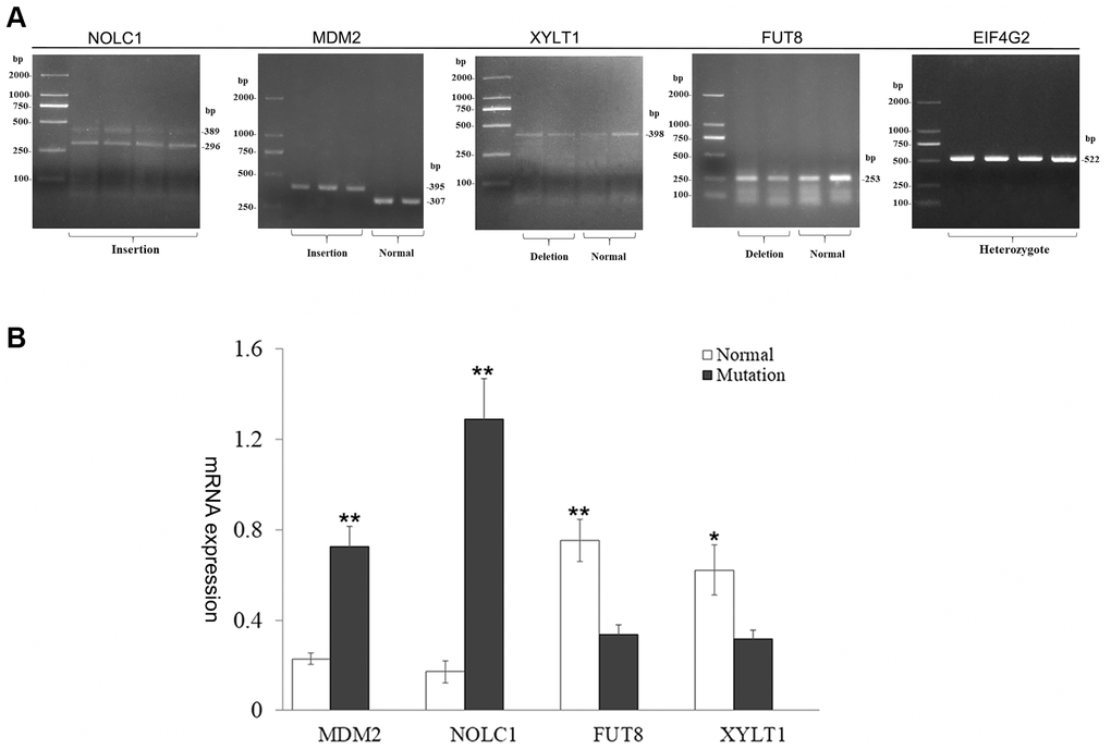 To further confirm the effect of SV events on gene expression and splicing, we selected an insertion mutation of exon 10 in NOLC1 gene (sv_24885), two deletion variations (sv_03788, sv_03789) among exon/intron boundaries of EIF4G2, one insertion mutations of 88 bp among 3' UTR of MDM2, and two intron deletion variants (sv_13380, sv_05472) for RT-PCR and Sanger sequencing validation. We isolated RNAs from the skin samples with same genotypes of the SV and detected the expression patterns (Figure 6A, Supplementary Figure 2). The results showed that 296 bp and 389 bp fragments were detected from the transcripts of NOLC1. Sequencing of the RT-PCR product indicated that 296 bp fragment was an abnormal splicing product which retained intron 10. Meanwhile, 395 bp and 307 bp fragments were determined from the transcripts of MDM2, respectively. The sequencing revealed that 88 bp fragment was inserted in the 3' UTR of MDM2. However, only a single fragment was detected from the transcripts of EIF4G2, FUT8 and XYLT1. The sequences of these fragments were in accordance with each other in different genotypes. In addition, we performed qRT-PCR analysis of NOLC1, MDM2, FUT8 and XYLT1 genes. It was found that the expression levels of MDM2 and NOCL1 with mutant genotypes were significantly higher than the normal transcripts, while the intronic deletion drove a decrease in transcription of FUT8 and XYLT1 genes (Figure 6B).