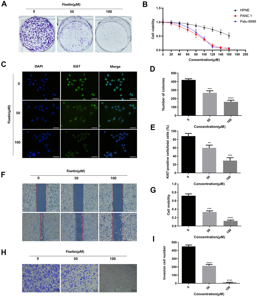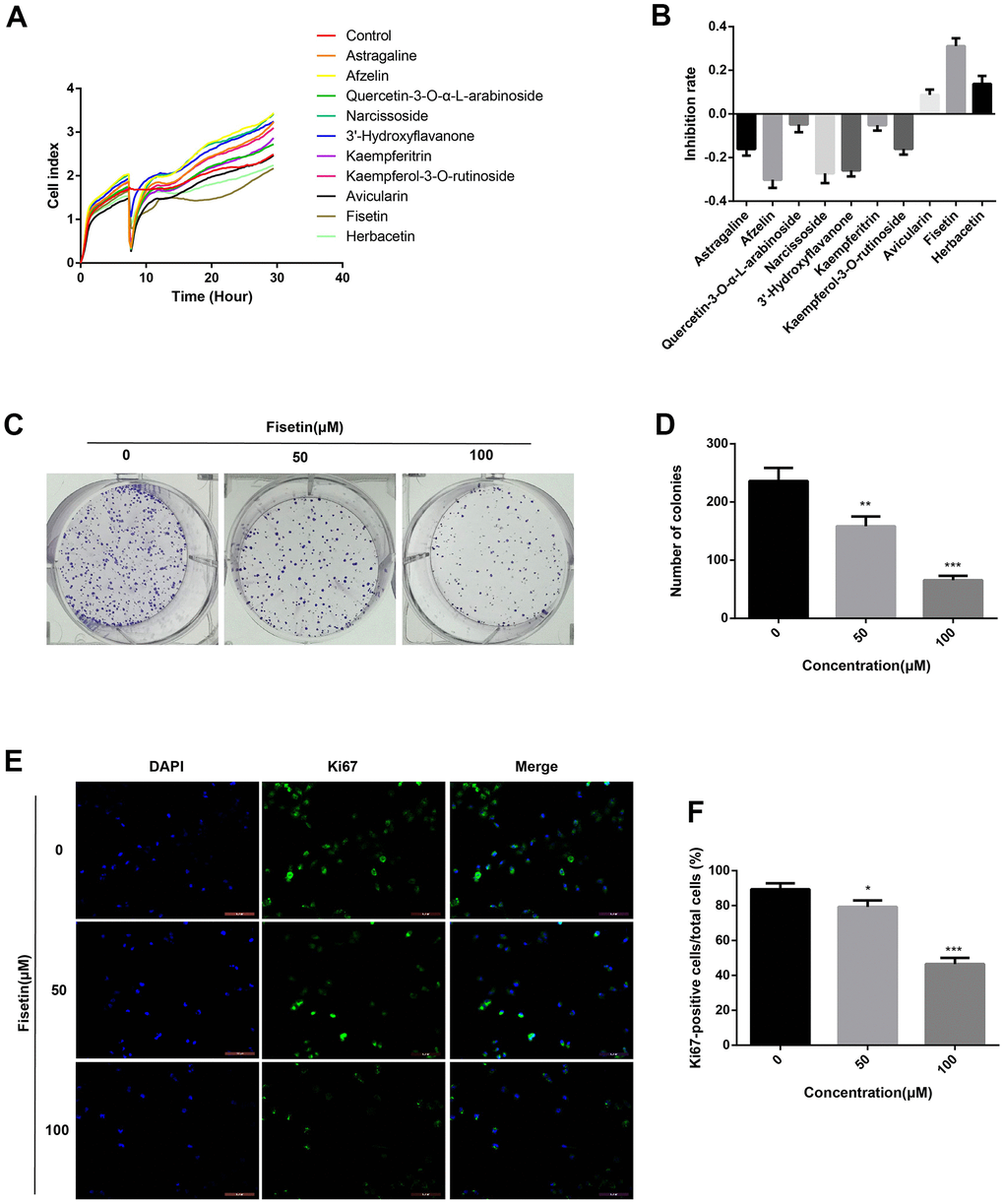 To detect the effects of Astragaline, Afzelin, Quercetin 3-O-α-L-arabinoside, Narcissoside, Avicularin, Fisetin, Herbacetin, 3'-Hydroxyflavanone and Kaempferol-3-O-rutinoside (50 μM) on the growth of human pancreatic cancer cell (PANC-1), unlabeled real-time cell analysis (RTCA) were carried out. As showed in Figure 1A, 1B, the growth of PANC-1 cells remarkably decreased after the administration of fisetin, Avicularin, and Herbacetin; among them, fisetin had the most potent inhibitory effect. Thus, we chose fisetin for subsequent studies. Next, to detect the long-term effects of fisetin on PANC-1 cells, as well as Patu-8988 cells proliferation, plate colony formation assay was conducted. The number of colonies of PANC-1 cells along with Patu-8988 cells treated with fisetin (50 μM, 100 μM) was considerably lower in contrast with that of the controls (Figures 1C, 1D, 2A, 2B), which shows that fisetin could dampen the growth and clonogenicity of the PANC-1 cells along with Patu-8988 cells. Then, we detected the expression of Ki67, a marker of cell proliferation. Immunofluorescence staining exhibited that proliferation of the PANC-1 cells along with Patu-8988 cells remarkably decreased after treatment with 50 μM or 100 μM fisetin (Figures 1E, 1F, 2C, 2D). All of these results indicate that fisetin can dampen the proliferation of pancreatic cancer cells via downregulating Ki67 expression dose-dependently.