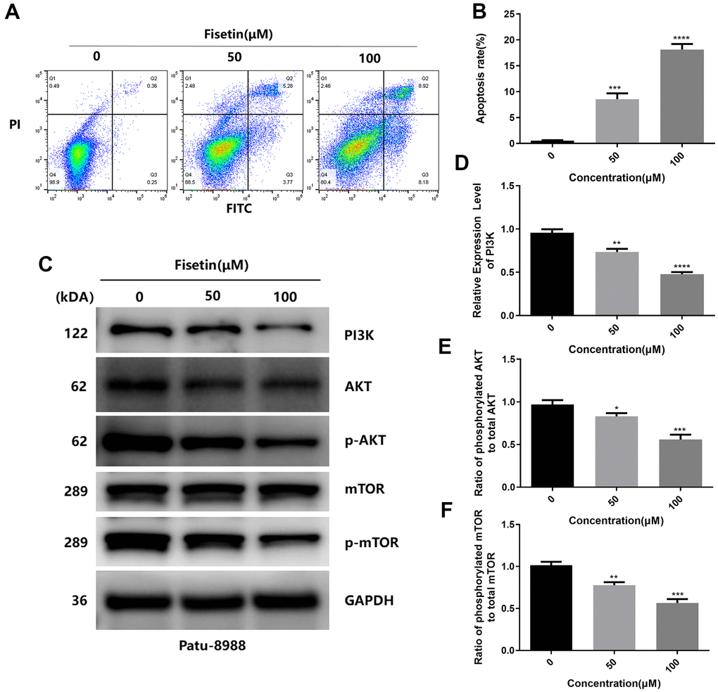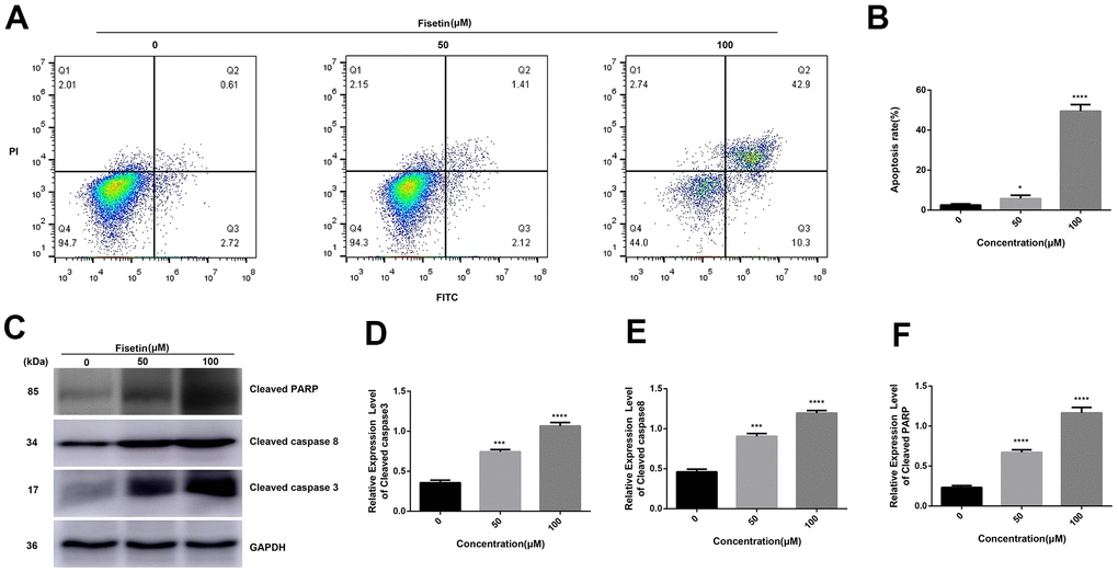 To detect the influence of fisetin on the apoptosis of human pancreatic cancer cells, AnnexinV-FITC/PI method was performed. As shown in Figures 3A, 3B, 4A, 4B after treatment with 50 μM or 100 μM fisetin for 24 hours, the fraction of pancreatic cancer cells apoptotic cells escalated from 3.33% to 53.20% in contrast with the control group. Meanwhile, the extent of pancreatic cancer cells apoptosis was enhanced as the concentration of fisetin increased. To assess the potential mechanism of fisetin-triggered apoptosis in pancreatic cancer cells, we determined apoptosis-linked proteins’ expressions via western blotting. As illustrated in Figures 3C–3F, the terms of activated caspase 3 and activated caspase 8 were drastically increased by the treatment of fisetin. We also found the expression of cleaved PARP was upregulated indicating that fisetin promoted apoptosis of PANC-1 cells through the mitochondrial-dependent cascade dose-dependently.