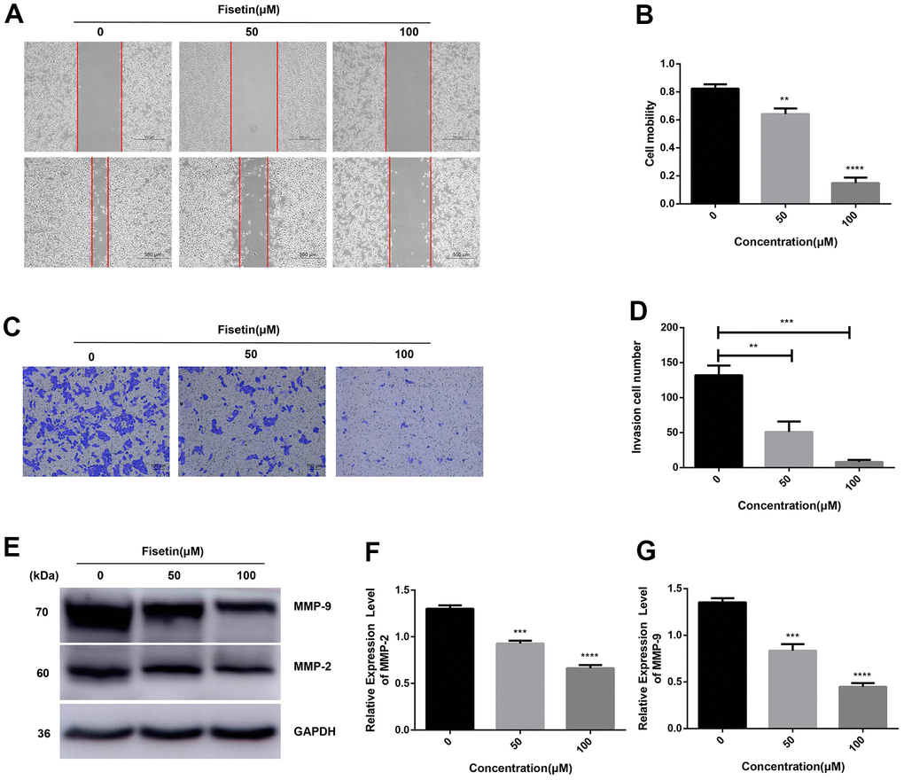 Next, we detected the ability of cell invasion through wound healing assay. As illustrated in Figure 5A, 5B, 2F, 2G. Fisetin remarkably reduced the migration capacity of Pancreatic cancer cells compared with the untreated group. Furthermore, transwell assay was adopted to determine the influence of fisetin on invasive ability in the PANC-1 cells along with Patu-8988 cells. The result of transwell assay showed that Pancreatic cancer cells treated without fisetin exhibited strong invasive ability, which was obviously reduced in the presence of fisetin (Figures 5C, 5D, 2H, 2I). Furthermore, we revealed that fisetin treatment dampened the expressions of MMP-2 along with MMP-9, which were involved in cellular metastasis (Figure 5E–5G). These data illustrate that fisetin can reduce the ability of infiltration along with migration in pancreatic cancer cells dose-dependently.