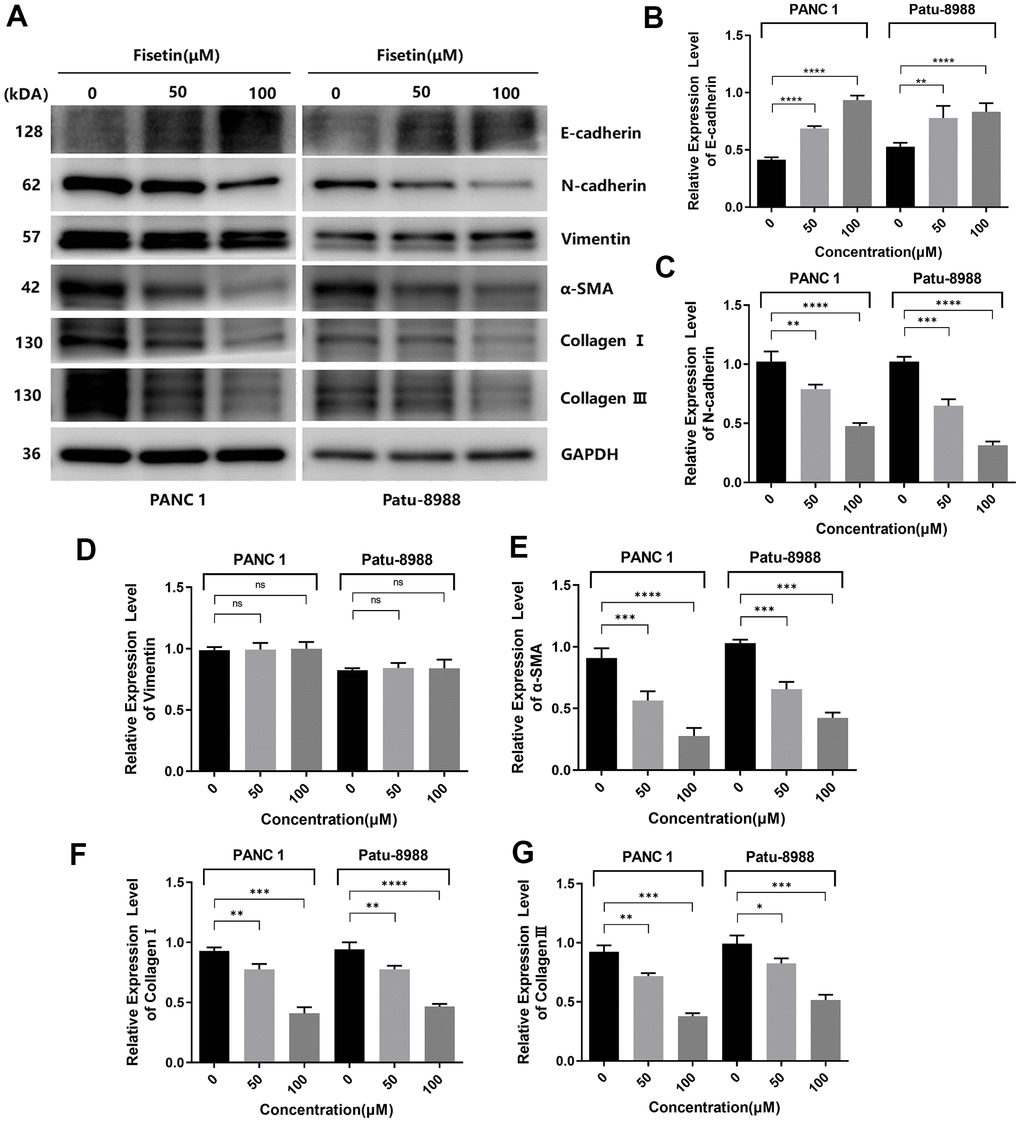 Several investigations have pointed out that EMT is crucial in promoting infiltration and migration in tumor cells [17, 18]. Therefore, we explored the influence of fisetin on EMT of different pancreatic cancer cell lines. In PANC-1, as well as Patu-8988 cells, fisetin did not remarkably dampen the content of cytoskeleton-linked protein Vimentin (Figure 6A, 6D). However, we found that fisetin could remarkably elevate the content of epithelial marker E-cadherin and dampened the content of interstitial markers N-cadherin along with a-SMA (Figure 6A–6D), which resulted in the decrease of extracellular matrix (ECM) secreted by stromal tumor cells, for instance type I and III collagen (Figure 6A, 6F, 6G). In addition, we have also observed that the expressions of metalloprotease system linked proteins, consisting of MMP-2 along with MMP-9, which have remarkable modulatory effects on tumor cell invasion and migration, are also inhibited by fisetin (Figure 5E), which proved again fisetin dampened infiltration, as well as migration in pancreatic cancer cells.