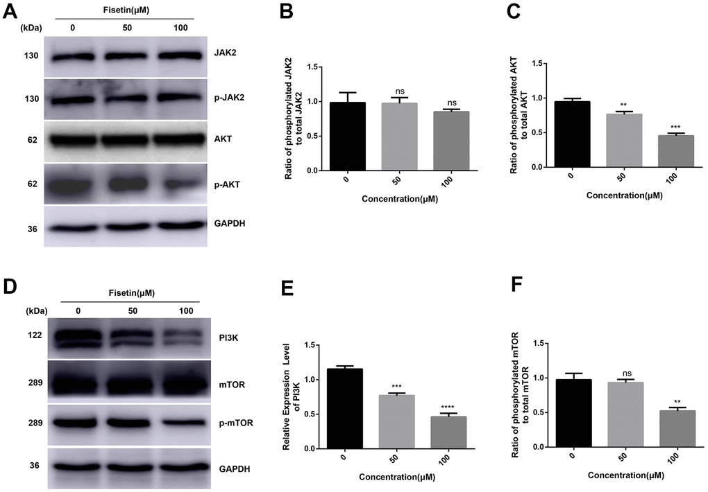 As reported, PI3K/AKT/mTOR participates in fisetin-triggered repression in the growth of laryngeal carcinoma cells [15]. Hence, we speculated that fisetin harbors protective influences may by targeting PI3K/AKT/mTOR axis in pancreatic cancer cells. As illustrated in Figures 7A–7C, 4C we observed the expressions of AKT, JAK2 and p-JAK2 proteins in groups inoculated with fisetin had no obvious changes, while p-AKT was downregulated with the control group. Furthermore, we found the total mTOR did not change, nonetheless the p-mTOR and PI3K decreased remarkably (Figures 7D–7F, 4C–4F), indicating that the PI3K/AKT/mTOR cascade participates in inhibitory of PANC-1 cells induced by fisetin. Therefore, we speculate that fisetin may repress the growth, invasion along with the migration of pancreatic cancer cells via dampening the PI3K/AKT/mTOR cascade.