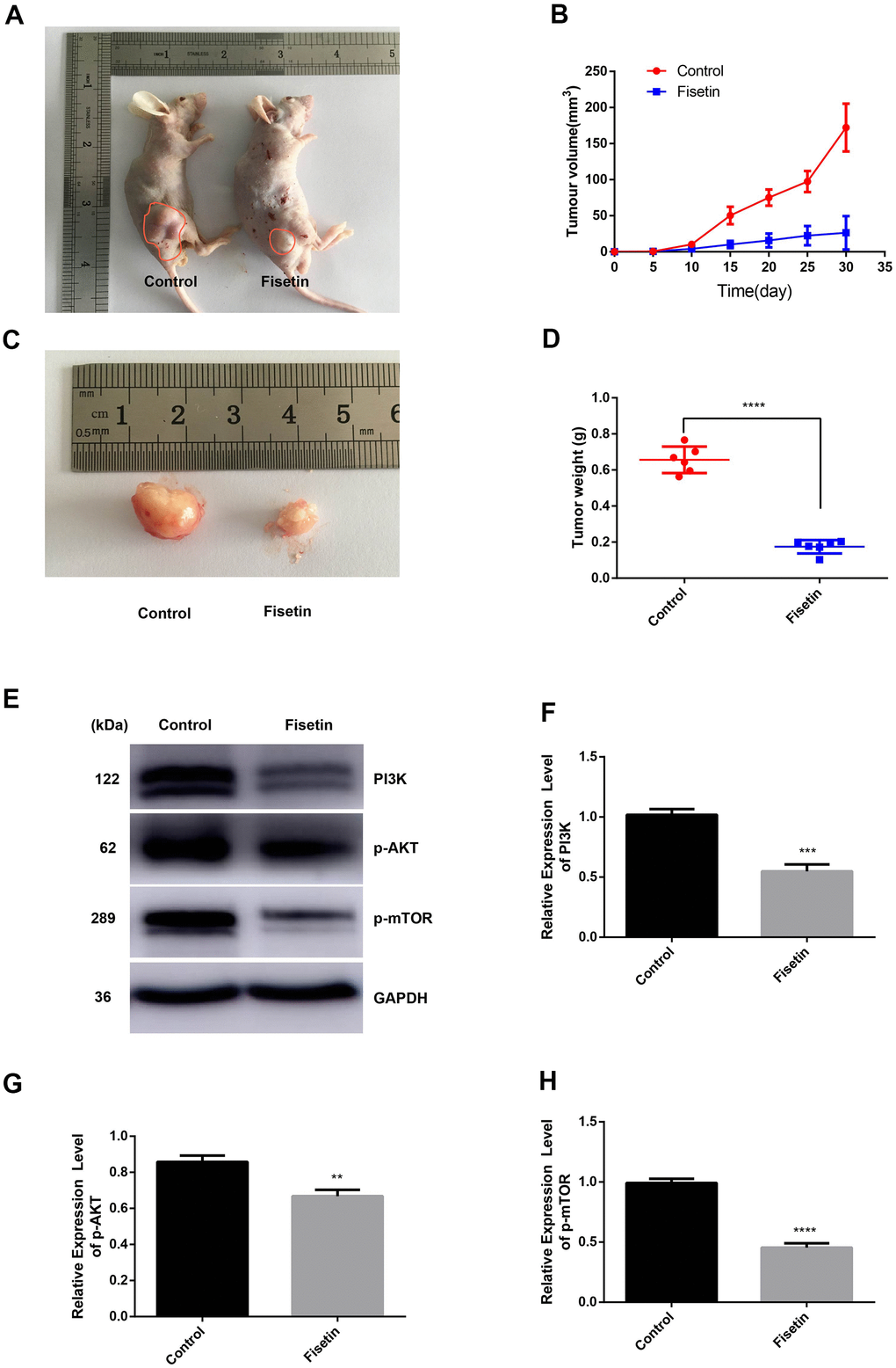 Furthermore, to evaluate the effects of fisetin on tumor growth in vivo, we conducted a xenografts experiment in nude mice. Figure 8A, 8C illustrates that a remarkable difference in tumor volume was seen as per the tumor image after 30 days. The mean tumor volume along with the weight were remarkably different between the study groups (Figure 8B, 8D). Western blotting illustrated that the expressions of PI3K, p-AKT, as well as p-mTOR proteins were downregulated obviously in fisetin treatment group (Figure 8E, 8F, 8H). These data exhibit that fisetin dampens the pancreatic tumor growth in vivo.