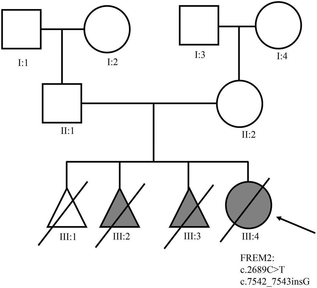 II: 1 (male, 32 years old) and II: 2 (female, 31 years old) had no clinical symptoms of FS (Figure 1). The female had pregnancies four times, including three adverse pregnancies (III:1, III:2, and III:3). The last pregnancy was terminated at 27 weeks of gestation. Prenatal ultrasound examination revealed that the proband (III:4) had 4.0 cm thickness of fetal ascites, edema of fetal skin, and a large amount of fluid in fetal abdominal cavity and enlargement of lungs. Postmortem examination showed that the proband did not have a left eyeball. It had bilateral syndactyly (toe) and mal-developed right kidney, which conformed to the three major diagnostic criteria of FS. Also, the location of both ears was symmetrically low, and the umbilical cord was swollen, which were the two minor criteria for FS diagnosis.