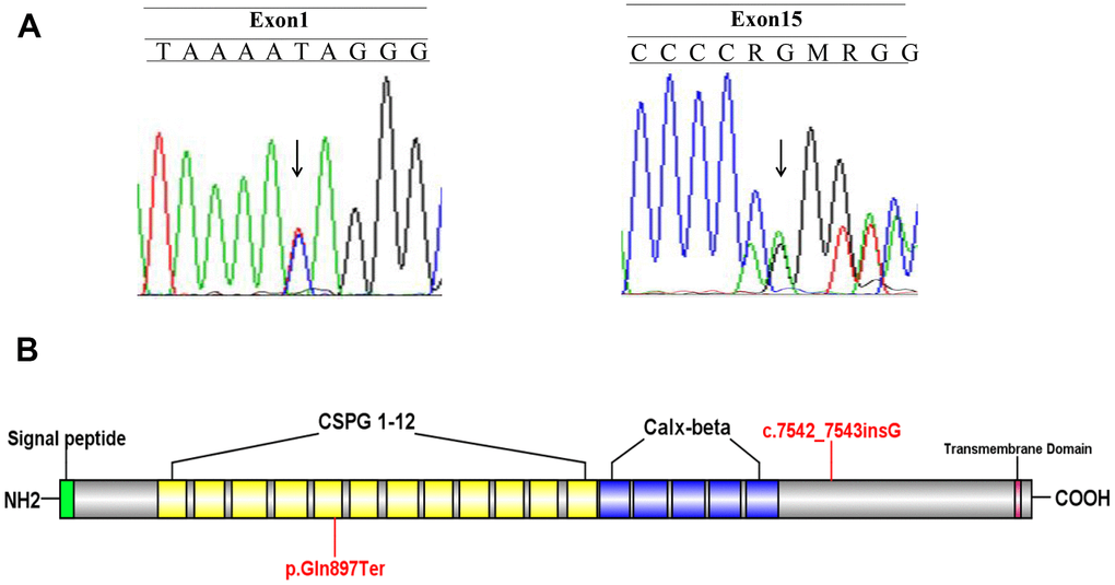 | c.2689C>T, p.Gln897Ter | c.7542_7543insG, p.V2516GfsX10 | |