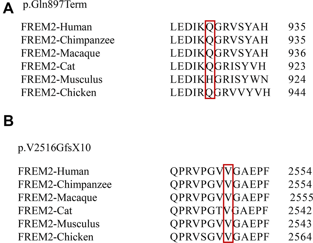 Sanger sequencing revealed that the mutation c.2689C>T (p.Gln897Ter) in the male (II:1) was inherited from his father I:1. The mutation c.7542_7543insG (p.V2516GfsX10) in female II:2 was inherited from her mother I:4 (Table 1). These two mutations were identified at the level of PVS1 according to the guidelines for assigning disease causality. Mutation Taster and PROVEAN software predicted both mutations appeared to produce truncated proteins, which seriously affected the function of FREM2.