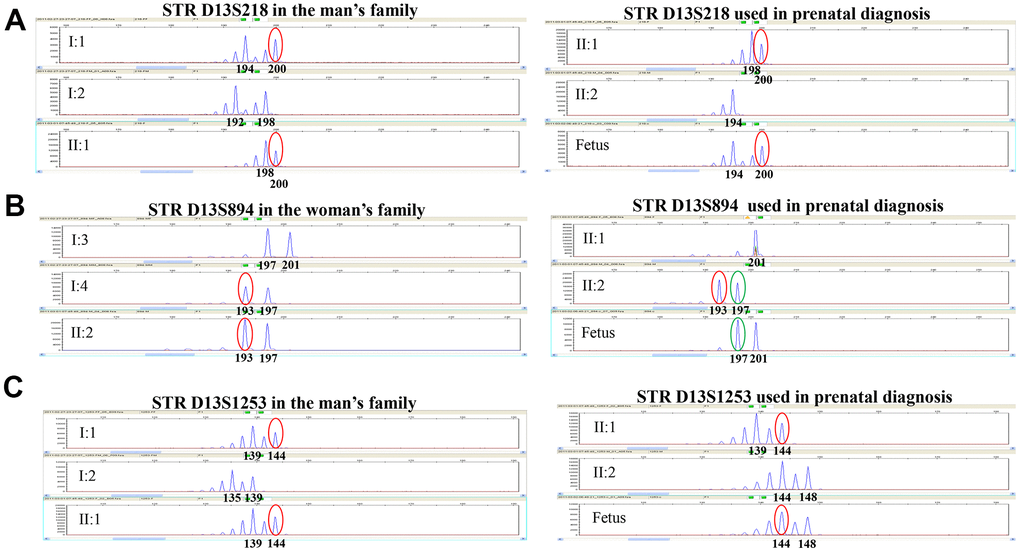 We then adopted the down-regulation scheme combined with the artificial cycle scheme to transplant E7 blastocyst. The woman finally got a clinical pregnancy. Sequencing of the fetal amniotic cell’s DNA revealed that the fetus was a heterozygous carrier with one FREM2 gene mutation (c.2689C>T, p.Gln897Ter). The mutation was inherited from its father (II1). The fetus’ karyotype was normal. The linkage analysis, D13S218, D13S894 and D13s1253 STR markers confirmed the above findings (Figure 4). Thus, continued pregnancy was recommended. During pregnancy, all ultrasonographic examinations did not show any morphological fetal abnormality. The baby was born on March 17, 2019 and showed normal development and growth after a follow-up of 12 months.