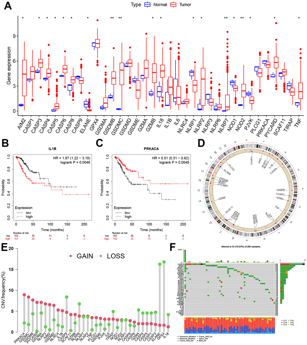 The TCGA database (https://portal.gdc.cancer.gov/) and the UCSC Xena database (https://xena.ucsc.edu/) were used to obtain CC data. Our research program was shown in Supplementary Figure 1. The RNA sequence data, clinicopathological parameters, and genomic mutation data (including somatic mutations and copy number variants (CNV)) were obtained for 306 CC tissues and 3 paraneoplastic tissue samples. Based on earlier studies [9, 12, 13], 35 PRGs were included, namely AIM2, CASP1, CASP3, CASP4, CASP5, CASP6, CASP8, CASP9, ELANE, GPX4, GSDMA, GSDMB, GSDMC, GSDMD, GSDME, GZMA, GZMB, IL18, IL1B, IL6, NLRC4, NLRP1, NLRP2, NLRP3, NLRP6, NLRP7, NOD1, NOD2, PJVK, PLCG1, PRKACA, PYCARD, SCAF11, TIRAP, and TNF, as detailed in Supplementary Table 1. Comparison of mRNA expression levels of PRGs in paraneoplastic tissue and CC tissues, and visualization of somatic mutations and CNV in CC tissues by the R software ‘maftools’ and the ‘Rcircos’ package. The Kaplan Meier-Plotter online platform (https://kmplot.com/analysis/) was used to further analyze the survival and prognosis of PRGs [14]. All subsequent statistical analyses were performed via R version 4.0.2. The screening criterion for differential expression of PRGs was P<0.05.