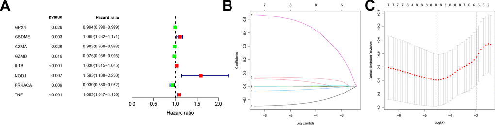 A survival analysis of the PRGs in the training dataset was conducted via a univariate Cox proportional regression model and screened for eight PRGs that had prognostic value (Figure 2A). Among these, GZMB and TNF were expressed in high level in CC tissue while NOD1 was significantly low (Supplementary Figure 2B).