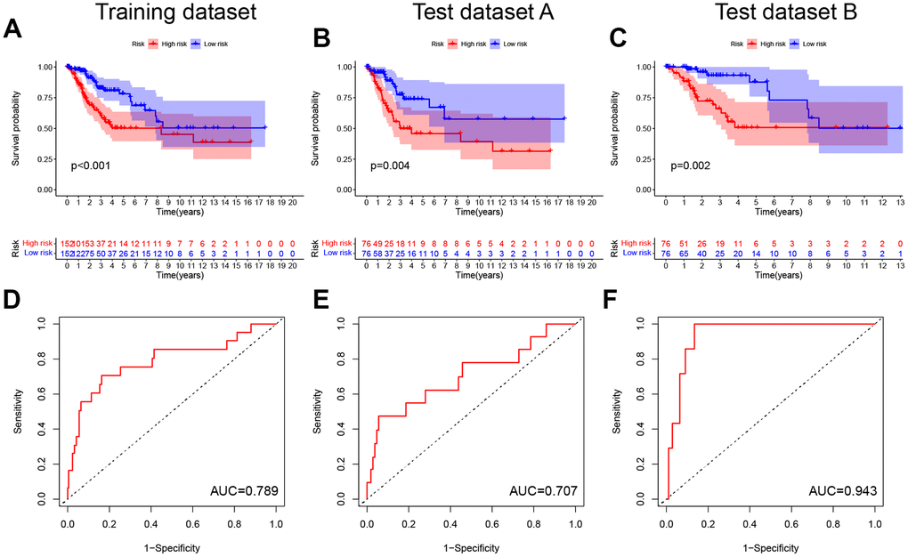 Following this, the pyroptosis-related signature was constructed by further downscaling the prognosis-related PRGs via Lasso regression (Figure 2B, 2C). The risk score was calculated for each patient using the expression, risk score= (-0.0037×EXPGPX4) + (0.0377×EXPGSDME) + (-0.0043×EXPGZMA) + (-0.026×EXPGZMB) +(0.0017×EXPIL1B) + (0.4741×EXPNOD1) + (-0.1298×EXPPRKACA) + (0.0642×EXPTNF). According to the median, the patients were divided into low-risk and high-risk groups, and the survival prognostic analysis showed a significant survival benefit for patients classified as low-risk (P < 0.001, Figure 3A), with an AUC value of 0.789 (Figure 3D). In test datasets A and B, the difference in survival prognosis (P < 0.05, Figure 3B, 3C) and predictive efficacy (AUC values of 0.707 and 0.943, respectively, Figure 3E, 3F) were validated similarly, thereby confirming the overall accuracy and validity of the prognostic signature. Interestingly, this prognostic model indicated a better prognosis for patients in the low-risk group than in the high-risk group in glioblastoma multiforme (GBM), brain lower grade glioma (LGG), liver hepatocellular carcinoma (LIHC), and uterine corpus endometrial carcinoma (UCEC) (Supplementary Figure 3).