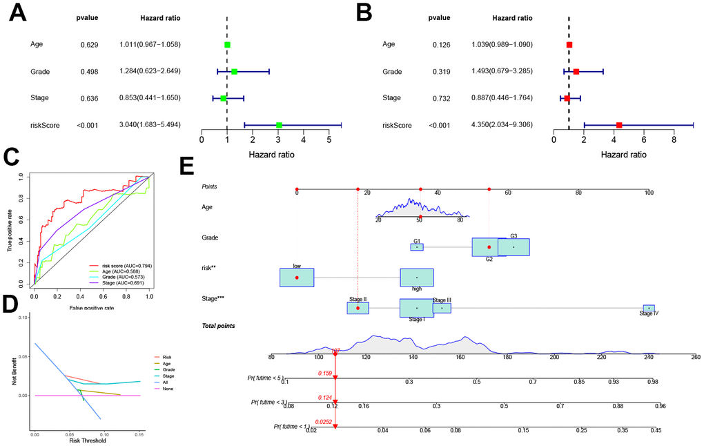 Univariate and multivariate COX analyses in conjunction with the patient age, stage, and grade, showed that this pyroptosis-related signature was an independent prognostic factor for OS in CC patients (p < 0.001, Figure 4A, 4B). In addition, the risk score corresponded to the highest AUC value (AUC = 0.794, Figure 4C) compared to other clinical features. The DCA further demonstrated the clinical usefulness of the signature (Figure 4D). The Nomogram for both the signature and clinical features was stable and accurate, and it can be used to predict the one-year, three-year, and five-year survival rates in CC patients (Figure 4E).