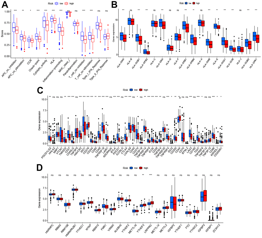 Considering this analysis of the immune function, the levels of HLA-related gene expression l were further studied as shown in Figure 6B. The levels of expression of HLA-DMA, HLA-DQB1, HLA HLA-DMA, HLA-DQB1, HLA-DRA, etc. were significantly higher in the low-risk group. As checkpoint inhibitors are crucial to immunotherapy, the differences in immune checkpoint expression between the two groups were analyzed in detail. Significant differences were demonstrated in the expression of PDCD1LG2, TMIGD2, CD27, CD40LG, etc. for the two groups (Figure 6C). Recent research suggests that m6A can regulate the immune response and also modify the immune microenvironment of the tumor [22]. On comparing the m6A-related expression of mRNA between the high- and low-risk groups, it was seen that YTHDF3 and LRPPRC ad significantly high levels of expression in the high-risk group (Figure 6D).