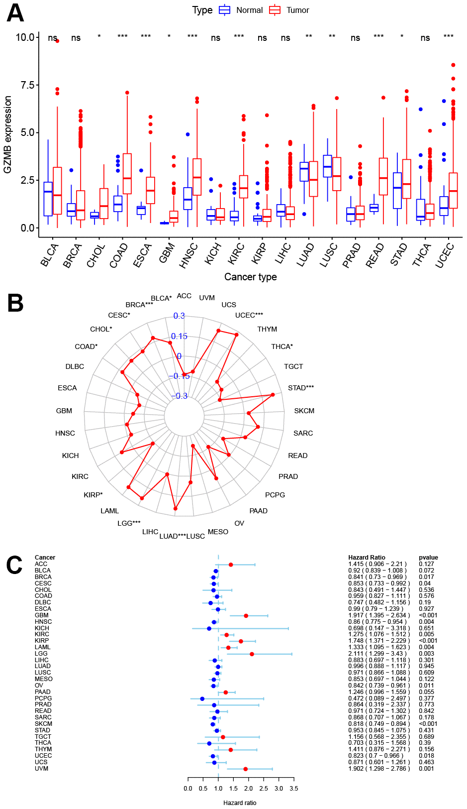 Pan-cancer expression analysis was performed for GZMB, which showed its significantly high expression in cholangiocarcinoma (CHOL), colon adenocarcinoma (COAD), esophageal carcinoma (ESCA), glioblastoma multiforme (GBM), head and neck squamous cell carcinoma (HNSC), kidney renal clear cell carcinoma (KIRC), rectum adenocarcinoma (READ), stomach adenocarcinoma (STAD), and UCEC tissues, while significantly low expression was observed in lung adenocarcinoma (LUAD) and lung squamous cell carcinoma (LUSC) tissues (Figure 7A). TMB is a biomarker that indicates response to immunotherapy, and so, the relation between the expression of GZMB and TMB was investigated. The levels of expression of GZMB were significantly and positively correlated with TMB in bladder urothelial carcinoma (BLCA), breast invasive carcinoma (BRCA), cervical squamous cell carcinoma, and endocervical adenocarcinoma (CESC orCC), CHOL, COAD, LGG, LUAD, STAD, and UCEC, Meanwhile, the correlation was significantly negative with kidney renal papillary cell carcinoma (KIRP) and thyroid carcinoma (THCA) (Figure 7B). Interestingly, the cases of CHOL, COAD, STAD, and UCEC in the high-GZMB-expression group also had high TMB values, and these are expected to be more sensitive to immunotherapy. In contrast, LUAD in the low expression group had low TMB values and so, may be resistant to cell scorch-related immunotherapy. Prognostic correlation analysis showed that the GZMB was negatively correlated with survival in BLCA, BRCA, CESC, ovarian serous cystadenocarcinoma (OV), skin cutaneous melanoma (SKCM), UCEC, and uveal melanoma (UVM). Meanwhile, it was positively correlated with GBM, KIRC, KIRP, acute myeloid leukemia (LAML), and LGG (P<0.05, Figure 7C).