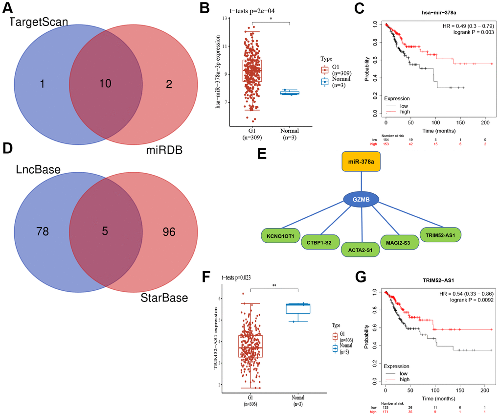 To elucidate the potential molecular regulation mechanism of GZMB in CC, we further constructed an mRNA-miRNA-LncRNA interaction network. First, based on the comprehensive prediction using the TarBase and mirTarBase databases, we screened out miRNAs that can target and regulate the GZMB core gene, and subsequently, ten miRNAs were obtained by considering the intersection (Figure 8A). Further analysis showed that miR-378a was significantly upregulated in CC (Figure 8B) and patients who show a high expression have a better prognosis for survival (Figure 8C). The LncRNA targets upstream of miR-378a were obtained from the LncBase and StarBase databases, and a total of five LncRNAs (Figure 8D) were obtained by intersection to finally construct the mRNA-miRNA-LncRNA interaction network (Figure 8E). Subsequently, these five LncRNAs were subjected to differential expression analysis and survival prognosis analysis, which showed that TRIM52-AS1 was significantly downregulated in CC (Figure 8F), and its high level of expression indicated a considerable survival advantage (Figure 8G). Thus, it may be concluded that the GZMB/miR-378a/TRIM52-AS1 regulatory axis plays an important regulatory role in the development of CC.