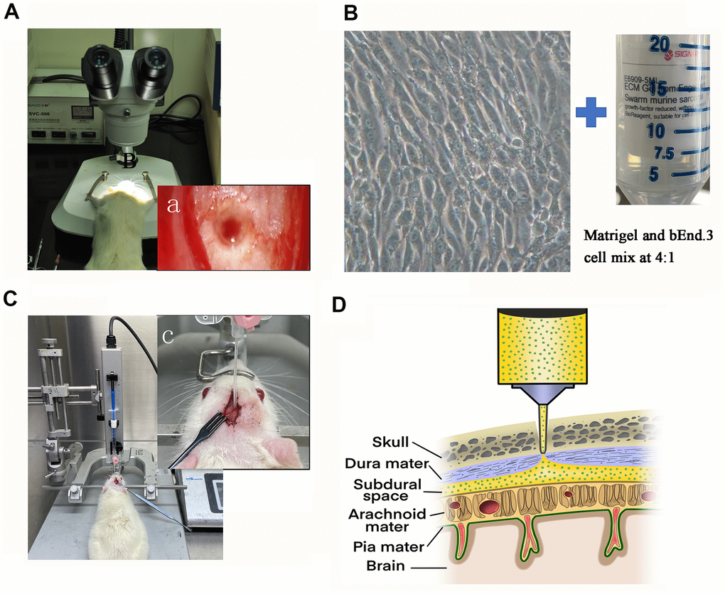 The design of the experiment was presented in Figure 1. We punctured the dura under a microscope (Figure 1A). The cell-matrix glue mixture was injected in the subdural space (Figure 1B–1D).
