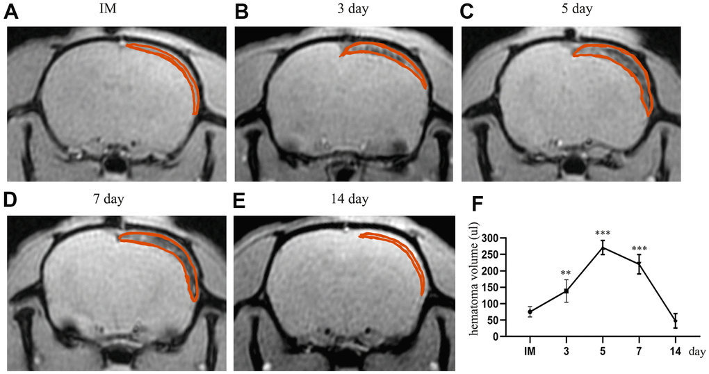 We tested the volume of the hematoma immediately, 3 d, 5 d, 7 d, and 14 d by MRI spectrometry (GRE) after CSDH injury. We observed dynamic trends in the hematoma volume at different timepoints after modeling. The volume of the hematoma increased and peaked at 5d post-injury (263.8±52.85 μl, p<0.05). After the peak time, the hematoma was gradually absorbed (Figure 2A–2E). At 14 d, most of the hematoma had been absorbed (47.63±21.96 μl, p>0.05). Based on these results we demonstrated that this model successfully mimicked the chronic process of CSDH rather than the acute process.