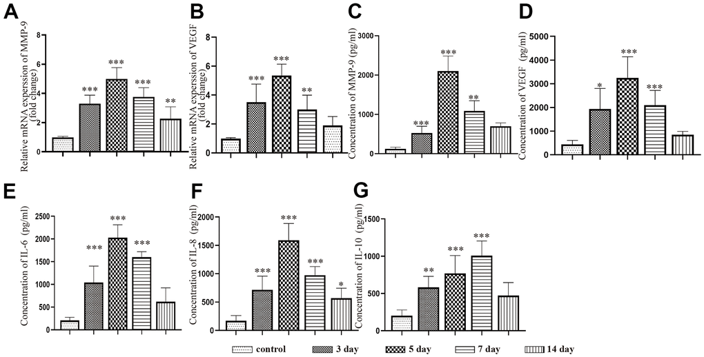 We performed PCR and ELISAs to test the changes in inflammatory and angiogenic factor expression in the neomembrane and capsule of the hematoma at different timepoints after CSDH injury. The mRNA expression of MMP-9 and VEGF was increased and peaked at 5 d. The expression of these mRNAs was decreased but still higher than that of the control (Figure 3A, 3B), which was consistent with the trend we detected by ELISAs. We also used ELISAs to test the levels of IL-6, IL-8 and IL-10 in the capsule of the hematoma. Similar trends in the expression of the MMP-9 and VEGF proteins were found (Figure 3C–3F). The expression of IL-10 was significantly increased and peaked at 7 d. After the peak time, the expression of IL-10 was reduced at 14 d post-injury but remained higher than that of the control (Figure 3G).
