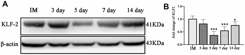 Western blotting and PCR were performed to detect the expression of KLF-2 in the neomembrane and capsule of the hematoma at different timepoints post-injury. The results showed that KLF-2 expression was inhibited with increasing hematoma volume and peaked at 5 d, reaching nearly half of the control expression, and then gradually increased at 7 d and 14 d but was not higher than that of the control group. More significantly, the trend of KLF-2 was opposite to that of the factors we tested previously (Figure 4A, 4B).