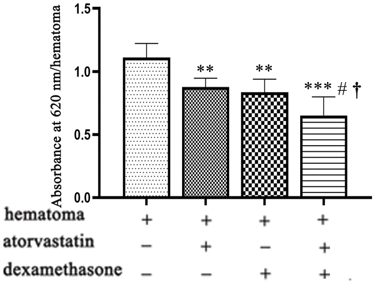 In the model group, we sacrificed the rats immediately (n=6) and at 3 d (n=6), 5 d (n=6), 7 d (n=6), and 14 d (n=6) to test the expression of related proteins and mRNAs by enzyme-linked immunosorbent assays (ELISA) and quantitative real-time polymerase chain reaction (qRT-PCR). Besides, western blot was performed with 18 rats (immediately: n=6; 3 d: n=6; 5 d: n=6; 7 d: n=6; 14 d:n=6) to evaluate the expression of proteins. There were 72 rats in the treatment group at 5 d (control: n=18; atorvastatin: n=18; dexamethasone: n=18; combined group: n=18) for H&E staining, Evans blue analysis, ELISAs, and PCR. The tissues were collected and fixed with 4% paraformaldehyde (PFA). Thereafter, the capsules of hematoma in different groups were collected and stored at -80° C for Western blotting, ELISAs, and PCR analysis at 5 d. For Evans blue injection and detection, the rats were infected with dye (2%, 1 ml/kg) through the right femoral vein and circulated for 30 min, and then euthanized under anesthesia. The neomembrane of the hematoma was dissected and fixed with 4% PFA. For Evans blue analysis, the tissues were incubated with formamide (60° C, overnight). The absorbance values of the extract at 620 nm were measured.