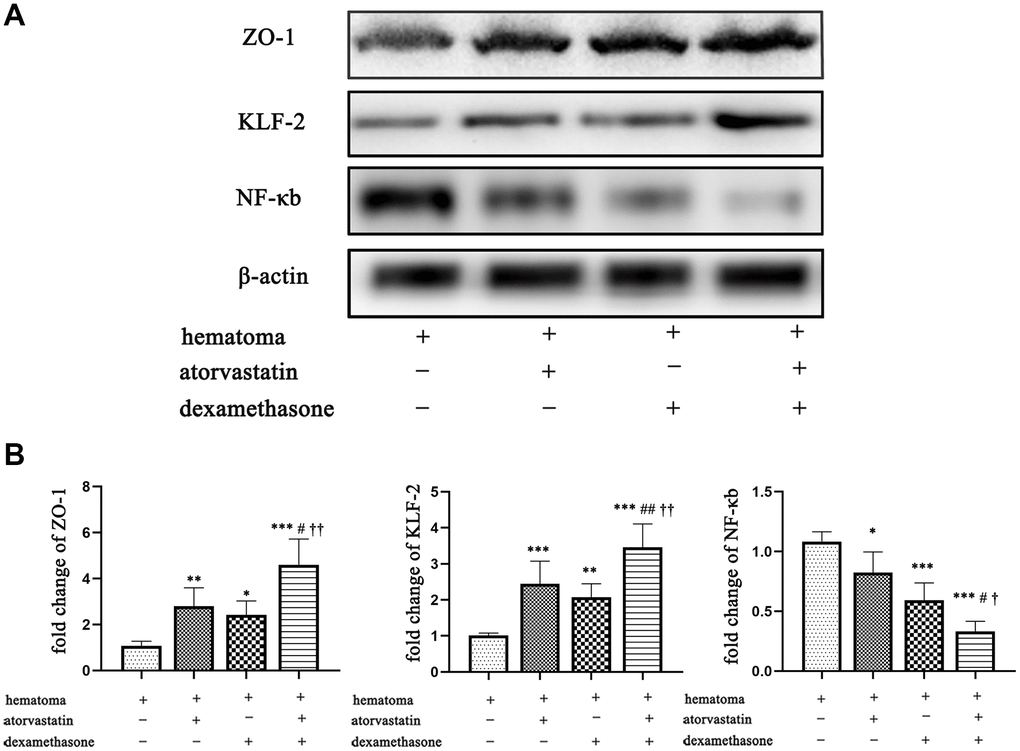 In conclusion, we demonstrated that atorvastatin combined with low-dose dexamethasone treatment could much more effectively improve inflammatory reactions and stabilize neovascularization, reduce the volume of hematoma and improve the outcomes of CSDH rats than single treatments. The association between KLF-2 and ZO-1 or NF-κb pathways may play pivotal roles in the process of hematoma formation and the prognosis of CSDH.