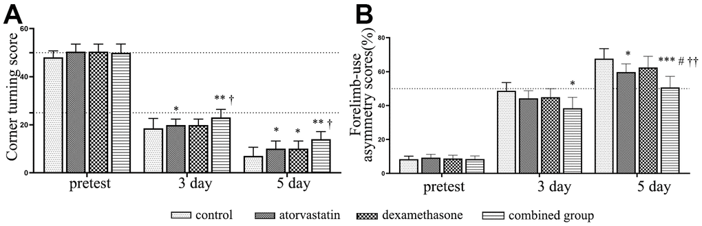 We further evaluated the neurological functional outcome by corner turning test scores and forelimb-use asymmetry scores in different treatment groups at different timepoints post-injury. Firstly, we calculated the number of rats died during the experiment timepoint in the different treatment group. We found that a total of 10 (36%) rats died in the CSDH group, which was much higher than the monotherapy group and combined treatment (atorvastatin group: n=6 (33%); dexamethasone group: n=4 (28%); combined group: n=3 (17%)). As shown in Figure 9, the rats in the hematoma group exhibited lower scores at all timepoints post-injury for the corner turning test scores, which indicated poor outcomes, than the rats in the treatment groups. In the forelimb-use asymmetry score, higher scores indicate more serious neurological dysfunction. The scores were strongly increased at 3 d and 5 d. However, the result indicated that the scores decreased in the treatment group, especially in the combined treatment group, compared with the injury group at 3 d and 5 d. All of the results indicated that the rats with CSDH have severe neurological functional deficits, but the combined treatment could more effectively rescue the injured rats and improve their neurological outcomes than the single treatments.