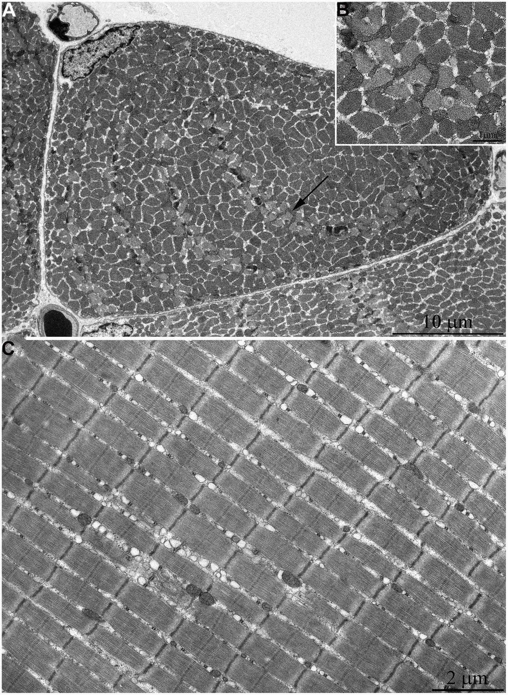 In Figure 2A, 2B, the ultrastructure of mitochondria in skeletal muscle of naked mole rat at the age 1 week is presented. At the longitudinal (Figure 2A) and cross sections (Figure 2B) of the muscle fiber small, widely spaced mitochondria can be seen. In our previous studies [40], the number of mitochondria in the skeletal muscles of rats has been reported to increase significantly shortly after birth. Moreover, mitochondria demonstrated stepwise fusion and formation of three-dimensional reticulum. This process is completed by the age of 1.5-2 months. As for mitochondria of 6-month-old naked mole rats they were still small and isolated from neighbors in both cross and longitudinal sections of the muscle fiber (Figure 3A–3C). By the age of 5 years, the ultrastructure of mitochondrial apparatus of naked mole rat undergoes acute changes. It can be clearly seen in Figure 4 that the number and size of mitochondria became significantly higher, mitochondrial clusters have appeared not only in the perinuclear and subsarcolemmal areas but also between myofibrils (indicated by arrows in Figure 4A, 4B). However, mitochondrial network is not formed.