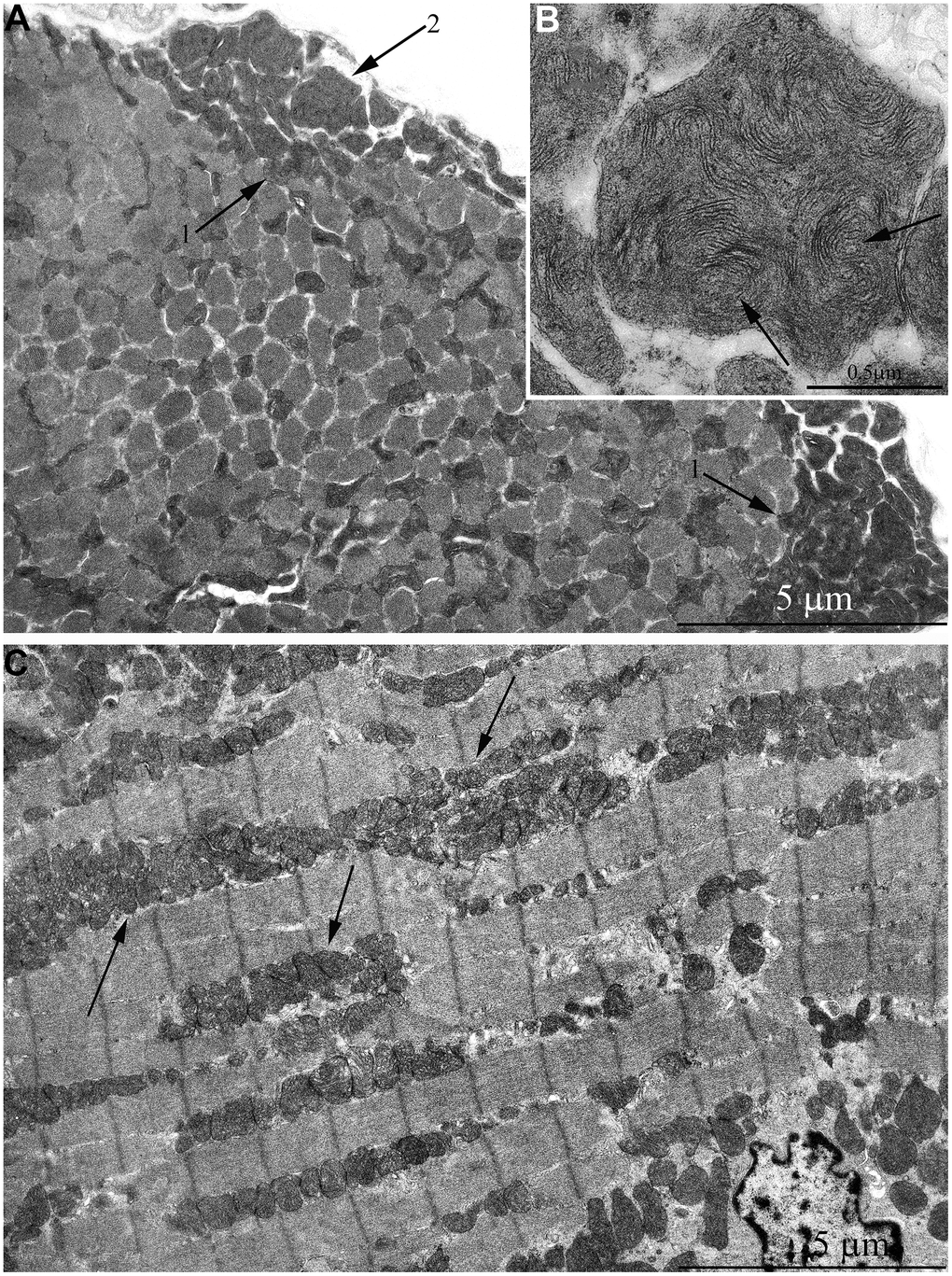At the age of 7 years, further increase of number and size of mitochondrial clusters located along myofibrils (indicated by arrows in Figure 5C) and in the subsarcolemmal area (arrow 1 in Figure 5A) were observed. Besides, very large isolated mitochondria appear in the subsarcolemmal area with non-typical morphology for skeletal muscle (Figure 5A, arrow 2). Figure 5B shows an image of the same mitochondrion at higher magnification. The whole intermembrane space of the mitochondrion is filled with cristae in the form of curled, wave-like structures (indicated by arrows). It should be noted that previously we found mitochondria of similar ultrastructure in cardiomyocytes of naked mole rat aged above 5 years [34].