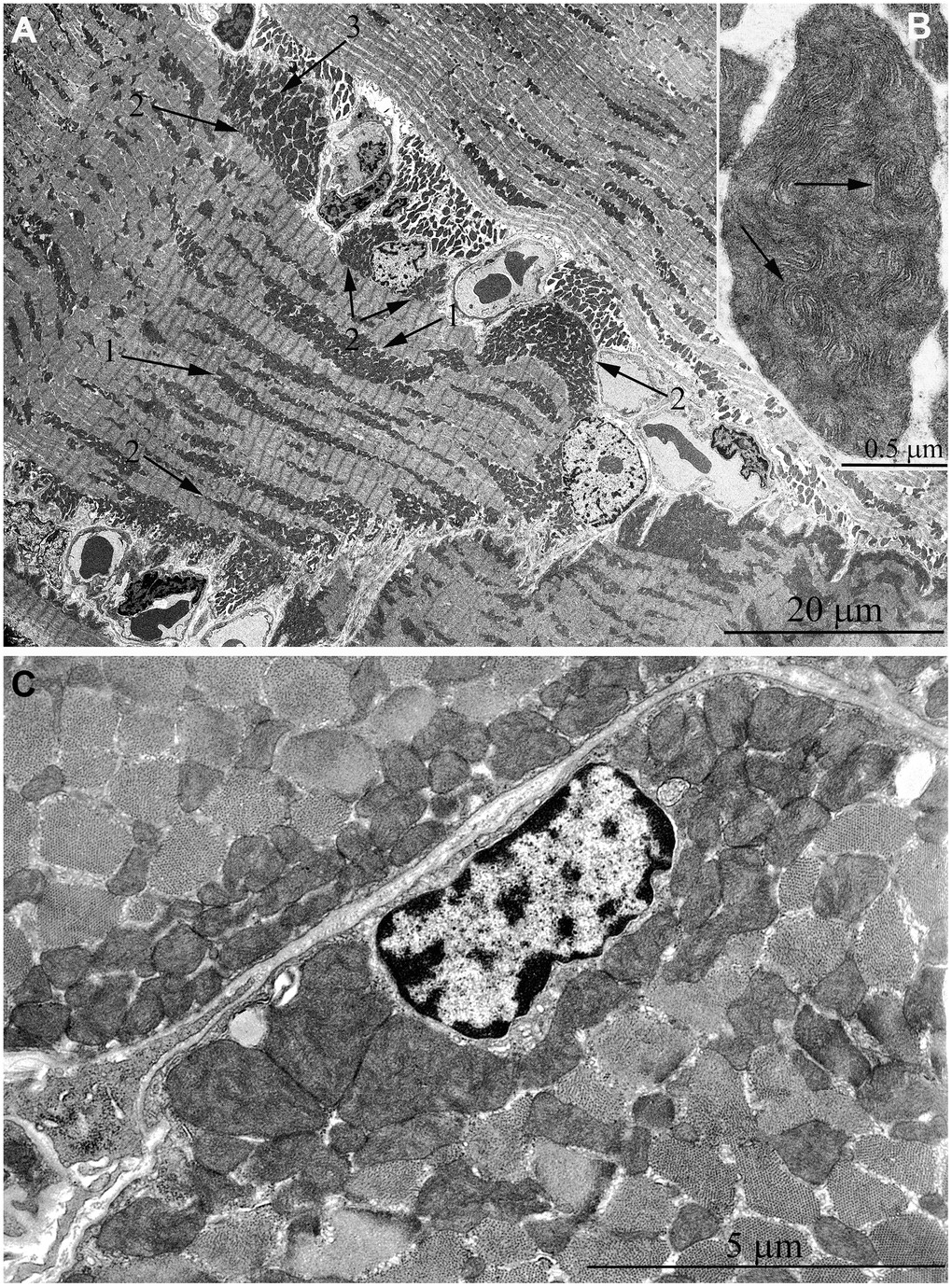 The same trend in the development of mitochondrial apparatus in skeletal muscle was detected in animals aged 11 years. The characteristic feature of the ultrastructure of skeletal muscle fibers in this group of animals is very large mitochondrial clusters both in the subsarcolemmal area and between myofibrils (indicated by arrows 1 and 2 in Figure 6A).