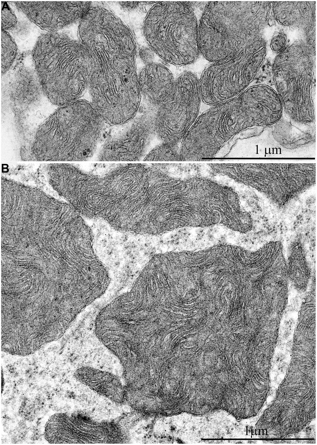 In addition, one prominent feature of mitochondrial ultrastructure in this group of naked mole rats is its internal organization which previously has not been observed in skeletal muscles of any animals. Figure 6B shows densely packed, wave-like mitochondrial cristae. Depending on the section plane, it can be seen that cristae are arranged in separate convoluted stacks. In Figure 7A, 7B shows the ratio of size and ultrastructure of mitochondria in skeletal muscle fibers of naked mole rat aged 6 months and 11 years at the same magnification. Significantly increased size of mitochondria, number of cristae, density of the matrix can be observed.