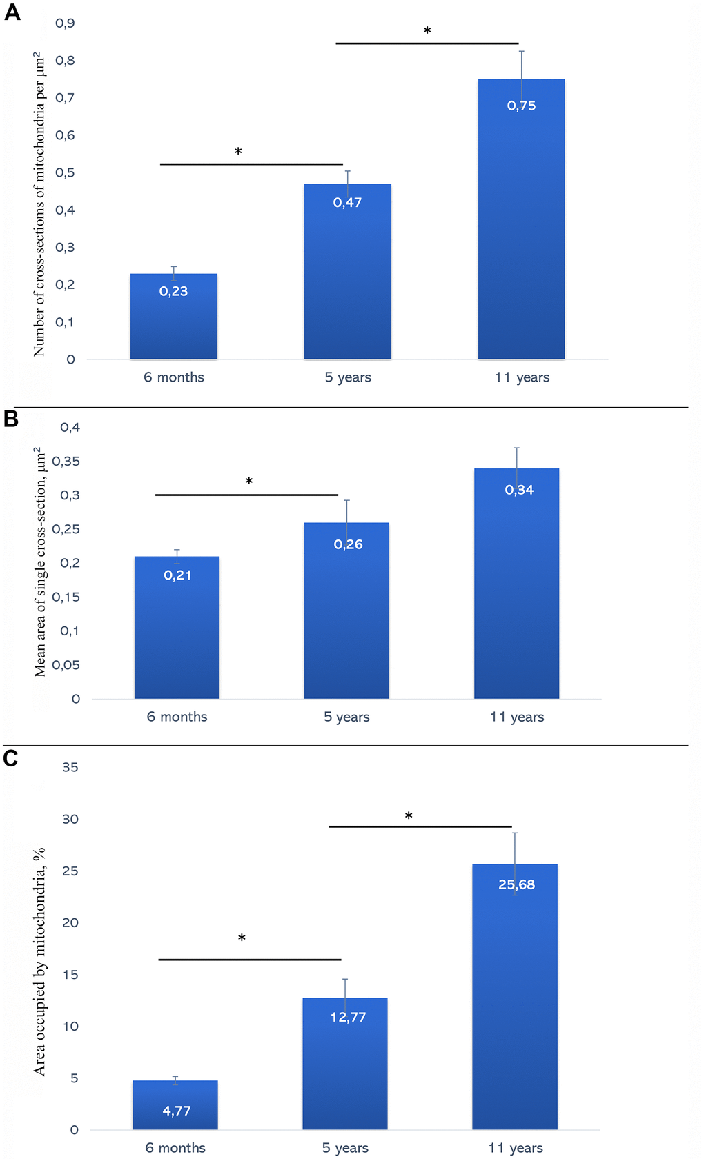 Morphometric analysis was performed in order to assess muscle-specific mitochondria development. Figure 8A shows the results of counting the number of mitochondrial sections per 1 μm2 of the muscle fiber. At the age of 6 month, mean number of mitochondria in the skeletal muscle were 0.23 ± 0.02 items/μm2 with the more than two-fold increase in 5-year-old animals (up to 0.47 ± 0.03 items/μm2). The reported differences are significant at p<0.05. In 11-year-old naked mole rat, the number of sections was ever larger (0.75 ± 0.07 items/μm2). The differences are significant at p<0.05.