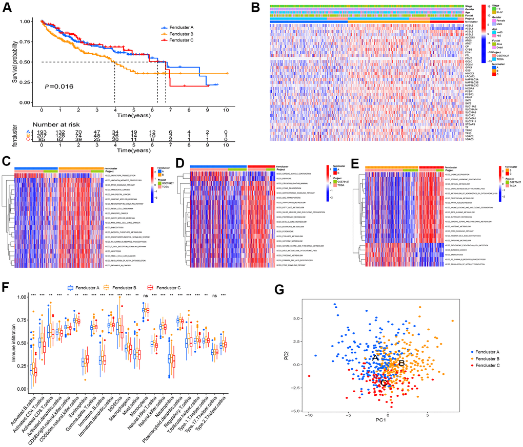 As indicated from the GSVA enrichment analysis, the Ferrcluster A was mainly enriched in “Olfactory transduction” and “cardiac music contraction”. The Ferrcluster B was largely enriched in the “mTOR signaling pathway” and “neurotrophin signaling pathway”. Ferrcluster C was mainly enriched in “adipokine signaling pathway”, “tyrosine metabolism” and “PPAR signaling pathway” (Figure 2C–2E). TME immune cell infiltration analysis showed that Ferrcluster B had very rich immune cells (e.g., B cell, CD4 + T cell, immune B Cell, natural killer T cell, MDSC, macrophagena as well as master cell), and the Ferrcluster C was significantly lower than the other two types of B cells and T cells. (Figure 2F). Subsequently, the principal component analysis of three different subtypes of ferroptosis reported a difference between the three different subtypes, i.e., ferroptosis-related gene could successfully distinguish the LIHC sample (Figure 2G).