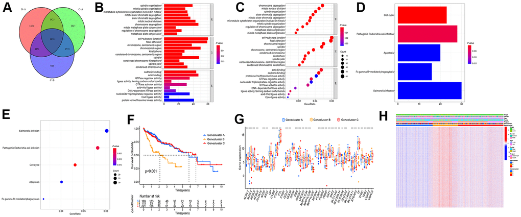 To study the potential biological behavior among the three types in depth, the filter condition was set as regulated P value < 0.01. On the whole, 1039 differential genes were obtained in three subtypes of LIHC (Figure 3A and Supplementary Table 4). The differential genes were subjected to GO and KEGG enrichment analysis using clusterProfiler (Figure 3B–3E). Subsequently, univariate COX analysis was conducted for the prognostic analysis of the 1039 differential genes to screen the prognostic genes. Moreover, the cluster analysis of prognostic genes was conducted to classify LIHC patients into three gene subtypes. To be specific, 169 LIHC patients were ferroptosis Genecluster A, 115 patients were ferroptosis Genecluster B, and 201 patients were ferroptosis Genecluster C (Supplementary Table 5). The survival analysis reported a difference in the survival among the three gene subtypes (P < 0.001), and the overall survival rate of Genecluster A and Genecluster C reached over that of Genecluster B (Figure 3F). The box chart presents the distribution of ferroptosis gene in three gene subtypes (Figure 3G). As suggested from the heat map results, LIHC patients in Genecluster B were mainly patients with stage III − IV, and most patients died of LIHC. As opposed to the mentioned, LIHC patients in Genecluster A and C were mainly patients with stage I − II, and the survival state was primarily survival patients (Figure 3H).