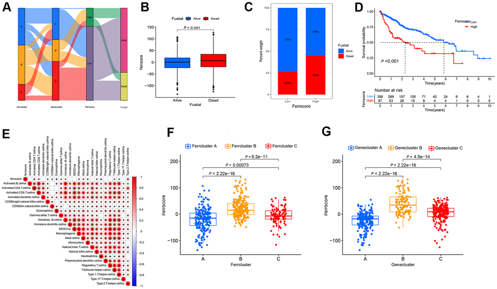 With a view to the individual heterogeneity and complexity of LIHC patients, we built a scoring model based on the mentioned prognosis-related ferroptosis genes, so as to accurately predict the prognosis and immunotherapy prospect of a single LIHC patient, quantify the ferrscore of LIHC patients, and facilitate individualized treatment (Supplementary Table 6). Sankey diagram presents the attribute variations of individual patients (Figure 4A). In accordance with cut-off values, 97 LIHC patients were classified as high-ferrscore groups. 388 patients were in the low-ferrscore group (Supplementary Table 7). As indicated from the histogram results, the ferrscore of patients who died of LIHC was larger than that of patients who survived LIHC (P = 0. 041) (Figure 4B). The survival patients took up 73% of the low-ferrscore group; 55% of the patients survived in the high-ferrscore group. The survival analysis revealed the differences in the survival between high- and low-ferrscore groups, and the high-ferrscore group had significantly lower survival than the low-ferrscore group (P < 0.001) (Figure 4C, 4D). For the correlation between the ferrscore and immune cells, ferrscore was negatively correlated with CD8+T cell, Eosinophil, Macrophagena, Mast. Cell, Monocyte, Neutrophilia and other immune cells, and it was positively correlated with CD4+T cell, Type. 2. T. helper. cells (Figure 4E). According to the results of the Kruskal-Wallis test, the ferroptosis genes cluster and the Ferrcluster were significantly inconsistent with the ferrscore, and the medians of the Ferrcluster B and the Genecluster B demonstrated the median scores of the Ferrcluster A and the Genecluster B as the maximal, while those of the Ferrcluster A and the Genecluster B as the minimal (Figure 4F, 4G).