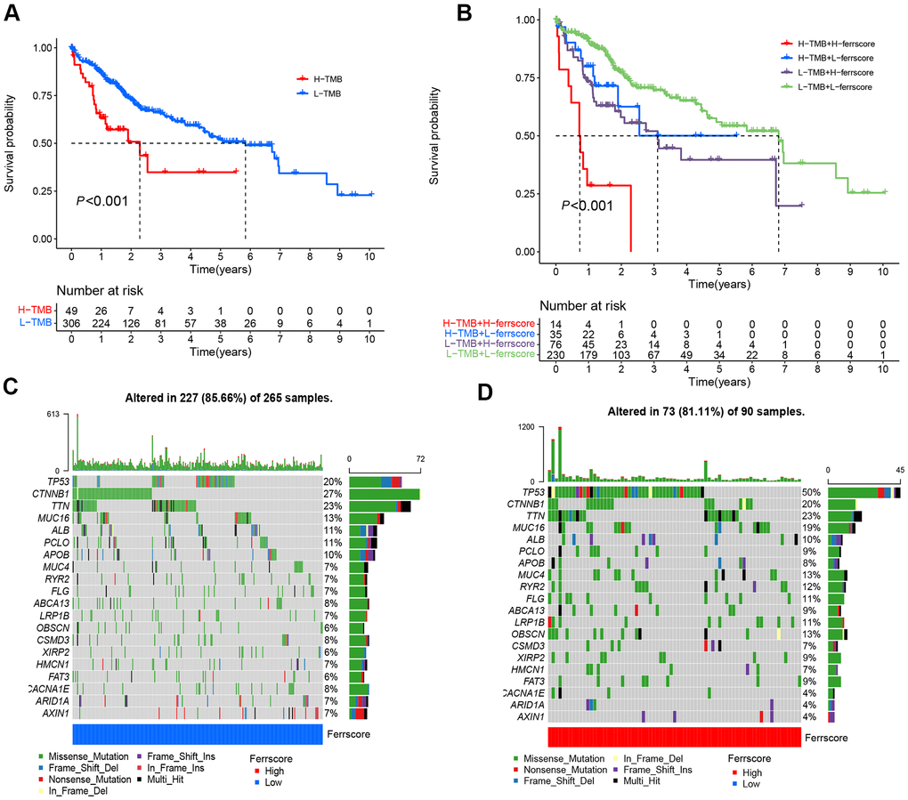 Given the cut-off value and TMB data of LIHC patients, LIHC patients fell to the high and low mutation load groups. To be specific, 49 LIHC patients were in the high mutation load group, and 306 patients existed in the low mutation load group. The survival analysis suggested a difference in the survival between the high and low tumor load groups (P < 0.001). The low mutation load group achieved the better survival than the high mutation load group (Figure 5A). As indicated from the joint analysis for ferrscore and the TMB analysis, the low TMB group combined with the low-ferrscore group achieved the optimal survival, the survival of the high tumor mutation group combined with the high-ferrscore group was the worst; the difference was statistically significant (P < 0.001) (Figure 5B). Moreover, the “Maftools” package was adopted to analyze the somatic mutations in the high-and low-ferrscore groups in the TCGA-LIHC cohort. The relevant results are presented in the figure, and the somatic mutation rate of the low-ferrscore group reached 85.66%, of which the CTNNB1 mutation rate was the maximal (27%), mainly the missense mutation. The mutation rate in the high-ferrscore group was 81.11%, of which the TP53 mutation rate was the maximal (50%), primarily the missense mutation (Figure 5C, 5D).