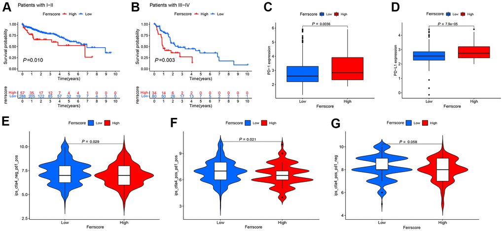 Whether the ferroptosis scoring model is suitable for LIHC patients with different stages was verified, and there were 345 patients with stage I – II. To be specific, 57 cases were from the high-ferrscore group, 288 patients were in the low-ferrscore group. 114 patients had stage III − IV, including 34 cases in the high-ferrscore group. As suggested from the results of the survival analysis, the difference between the high- and low-ferrscore groups was statistically significant (P < 0.05) (Figure 6A, 6B), and this ferroptosis scoring model was suggested to be suitable for clinically patients with stage I-IV in clinical practice. The expression of immune checkpoint inhibitor genes PD-1/PD-L1 in the high/low-ferrscore groups was assessed. As revealed from the results, the expression of PD-1/PD-L1 in the high-ferrscore group was significantly higher than that in the low-ferrscore group (Figure 6C, 6D). According to the immunotherapy results, the low-ferrscore group received the PD-1, and these patients having received the combination of the PD-1 and the CTLA4 achieved the better results than the high-ferrscore group (P < 0.05) (Figure 6E, 6F). The CTLA4 treatment alone did not differ in the high/low-ferrscore groups (P > 0.05) (Figure 6G).
