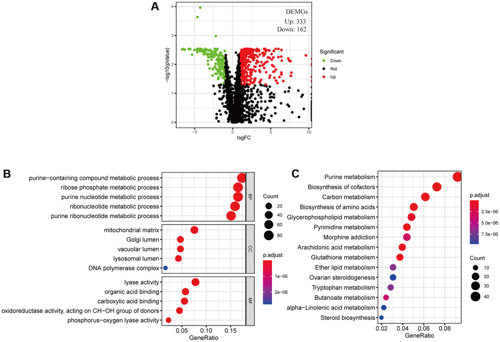 The cancer cell metabolic gene set comprising 2071 genes was downloaded from ccmGDB (https://bioinfo.uth.edu/ccmGDB/). A total of 495 CC-specific mRNAs (1320 upregulated and 1944 downregulated) were identified as differentially expressed metabolic genes (DEMGs), with Limma package using P value < 0.05 and |logFC| > 1 as screening criteria. The volcano map exhibits significant differences and distribution of mRNAs in CC based on the fold change (Figure 1A). GO analysis showed that the DEMGs were significantly associated with purine-containing compound metabolic, ribose phosphate metabolic, purine nucleotide metabolic, ribonucleotide metabolic and purine ribonucleotide metabolic processes (Figure 1B). And the pathways such as purine metabolism, biosynthesis of amino acids, pyrimidine metabolism, biosynthesis of cofactors and carbon metabolism were mainly enriched in the KEGG pathways (Figure 1C).