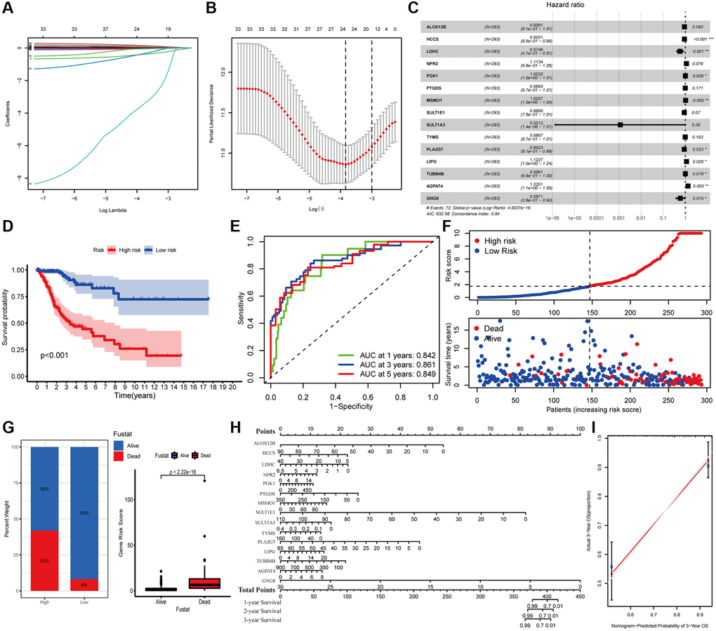 The survival difference of the DEMGs was analyzed by Kaplan-Meier method and log-rank analysis. There are 72 genes remarkably related to the prognosis of CC (Supplementary Figure 1). A total of 15 DEMGs were incorporated into the multivariate Cox regression analysis after univariate Cox and Lasso regression analysis (Figure 2A–2C). A multivariate Cox proportional hazards regression model was subsequently utilized to build the metabolic gene-associated prognostic model (MGPM) risk signature and calculate the risk score of each individual, patients were then divided into low- and high-risk groups using the median risk score as a cut-off. And nine out of fifteen variables ((HCCS, LDHC, PGK1, MSMO1, PLA2G7, LIPG, TUBB4B, AGPAT4 and GNG8) had significant statistical difference (P < 0.05) in MGPM (Supplementary Table 1). The survival analysis of the MGPM using the Kaplan–Meier method indicated that the patients in the high-risk group had a shorter overall survival compared with those in the low-risk group, and there was a significant difference between them (P < 0.001, Figure 2D). The ROC curve analysis represented a favorite prognostic value for this model in evaluating the overall survival of patients with CC (1-year AUC = 0.842, 3-year AUC = 0.861, 5-year AUC = 0.849; Figure 2E). The survival status of each patient was evaluated according to the risk score (Figure 2F). Compared with the low-risk group, patients have a shorter survival time and a higher incidence of death in the high-risk group (Figure 2F). The percentage of deaths in the low- and high-risk groups was 42% and 8%, respectively. There is a statistical difference between them (P < 2.22E-16, Figure 2G). Additionally, the nomogram was employed to depict the prospective survival of CC patients (Figure 2H), and the calibration plot was performed to assess the discernment of the MGPM-based risk signatures, and the result exhibited its predicted value was virtually coincided with the actual value (Figure 2I). The clinicopathological characteristics of CC patients in this model are detailed in Supplementary Table 2.