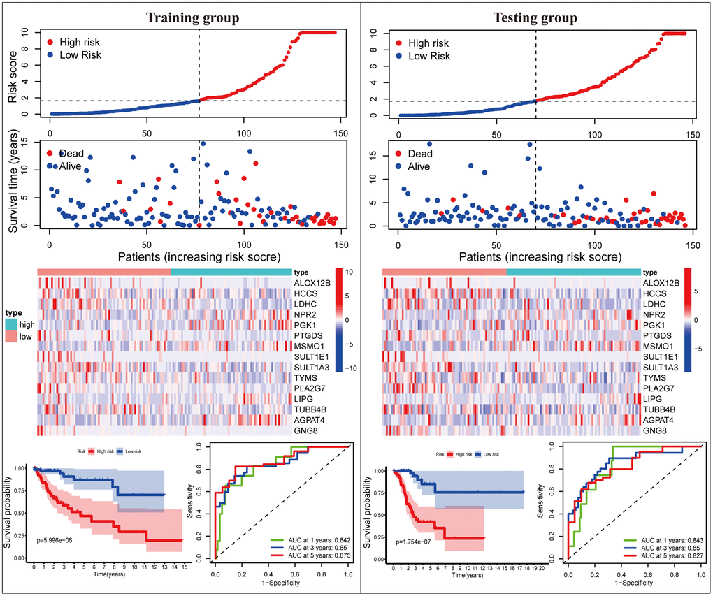 Subsequently, we proceeded with internal verification in the training (N = 147) and testing (N = 146) groups to evaluate the accuracy and robustness of the MGPM comprising fifteen DEMGs (Figure 3). From top to bottom, the risk score of each sample was calculated and ranked based on the MGPM in the training and testing data groups, respectively. And then, the overall survival status of CC patients according to the risk score distribution was presented using a scatter plot. Both data sets showed patients with high-risk score were bound up with a higher mortality rate, and the increase of risk score was proportional to the death rate in CC patients. A heatmap presenting the expression profiles of those signature genes displayed those patients in the high-risk group were more geared to elevate NPR2, PGK1, MSMO1, LIPG and AGPAT4 levels, while those in the low-risk group were more inclined to elevate ALOX12B, HCCS, LDHC, PTGDS, SULT1E1, SULT1A3, TYMS, PLA2G7, TUBB4B and GNG8 levels, these finding in the training dataset showed consist with the testing dataset. Lastly, Kaplan-Meier survival curve analysis indicated that the overall survival of patients with high-risk score was remarkably shorter than those with low-risk score in both datasets (P < 0.001), and ROC curve analysis also indicated there was a favorite prognostic predictive value of the MGPM both in training set (1-year AUC = 0.842, 3-year AUC = 0.861, 5-year AUC = 0.849) and testing set (1-year AUC = 0.843, 3-year AUC = 0.85, 5-year AUC = 0.827).