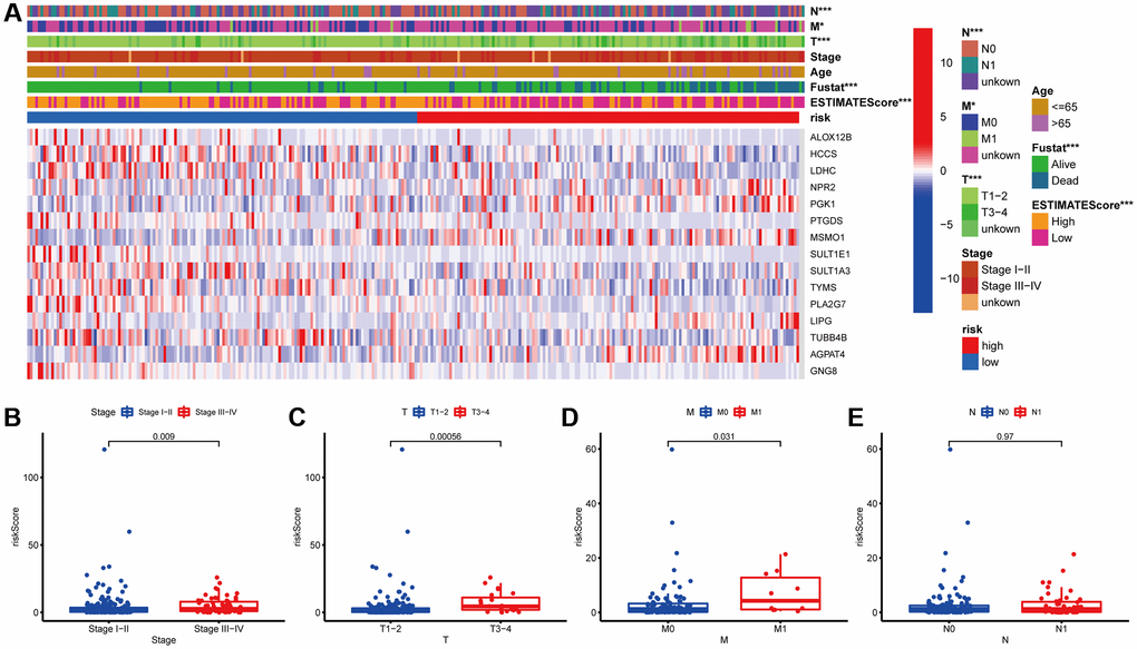 Next, the association between the MGPM-based risk signatures and the clinicopathological parameters was analyzed. A heatmap was employed to present the correlations between the MGPM-based risk signatures and clinicopathological variables. The results indicated that there were significant statistical differences between them regarding the tumor node metastasis classification (P < 0.01), survival status (P < 0.001) and estimate score (P < 0.0001) (Figure 4A). The differences in clinicopathological parameters were then evaluated between the low- and high-risk groups of MGPM by Wilcoxon rank-sum test. There are statistically significant differences in stage (P = 0.009) primary tumor (T, P = 0.00056) and lymph nodes (N, P = 0.031), while no statistical differences in remote metastasis (M, P = 0.97) (Wilcoxon signed-rank test, Figure 4B–4E).
