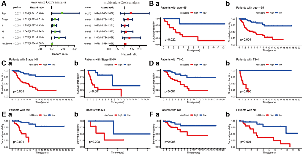 To explore its clinical application and usability, we performed Cox regression analysis on common clinical characteristics. The results exhibited that the risk score of MGPM had statistically significant differences in both univariate- and multivariate-Cox regression groups (P < 0.001), which indicated the MGPM could as an independent index for prognosis to forecast the OS of CC patients (Figure 5A, Supplementary Table 3). After stratifying patients according to clinicopathological parameters, the overall survival rate of patients with the following characteristics will be significantly shortened in the high-risk group by Kaplan–Meier analysis, including age ≤ 65 (P < 0.001) and age > 65 (P = 0.022) (Figure 5B), stage I/II (P < 0.001) and stage III/IV (P < 0.001) (Figure 5C), T1-2 stage (P < 0.001) and T3-4 stage (P = 0.006) (Figure 5D), M0 stage (P < 0.001) (Figure 5E (a)), N0 stage (P = 0.006) and N1 stage (P = 0.001) (Figure 5F). However, there were no significance in M1 stage patients (P = 0.208, Figure 5E (b)) in both the high- and low-risk groups.