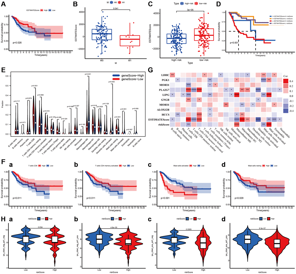 The co-expression analysis of twenty-one tumor-infiltrating immune cells and the MGPM-based risk signature and tumor microenvironment was then performed (Figure 6G). The results indicated T cell CD8 had a positive correlation with ESTIMATEScore (R = 0.34, P = 1.51E-09), PLA2G (R = 0.29, P = 2.8E-07) and GNG8 (R = 0.17, P = 0.003) expressions, a negative correlation with risk score of MGPM (R = −0.18, P = 0.002), LIPG (R = −0.21, P = 0.0003) and MSMO1 (R = −0.21, P = 0.00024) expressions. T cells regulatory (Tregs) had a positive correlation with the expressions of PGK1 (R = −0.17, P = 0.003), MSMO1 (R = −0.14, P = 0.014), LIPG (R = −0.16, P = 0.004), ALOX12B (R = −0.12, P = 0.041) and HCCS (R =−0.12, P = 0.045). Mast cells resting had a positive correlation with the LDHC expression (R = 0.15, P = 0.009), and a negative correlation with risk score (R = −0.19, P = 0.0012), LIPG (R = −0.19, P = 0.001) and PGK1 (R = −0.23, P = 4.25E-05) expressions. Mast cells activated had a positive correlation with risk score (R = 0.36, P = 1.2E−10), LIPG (R = 0.34, P = 2.32E-09) and PGK1 (R = 0.17, P = 0.003) expressions, a negative correlation with ESTIMATEScore (R = −0.16, P = 0.0049).